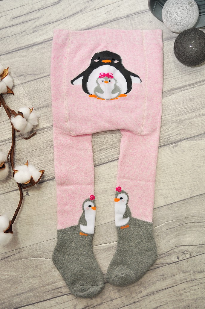Różowe rajstopki frotte dla dziewczynki z pingwnikami.