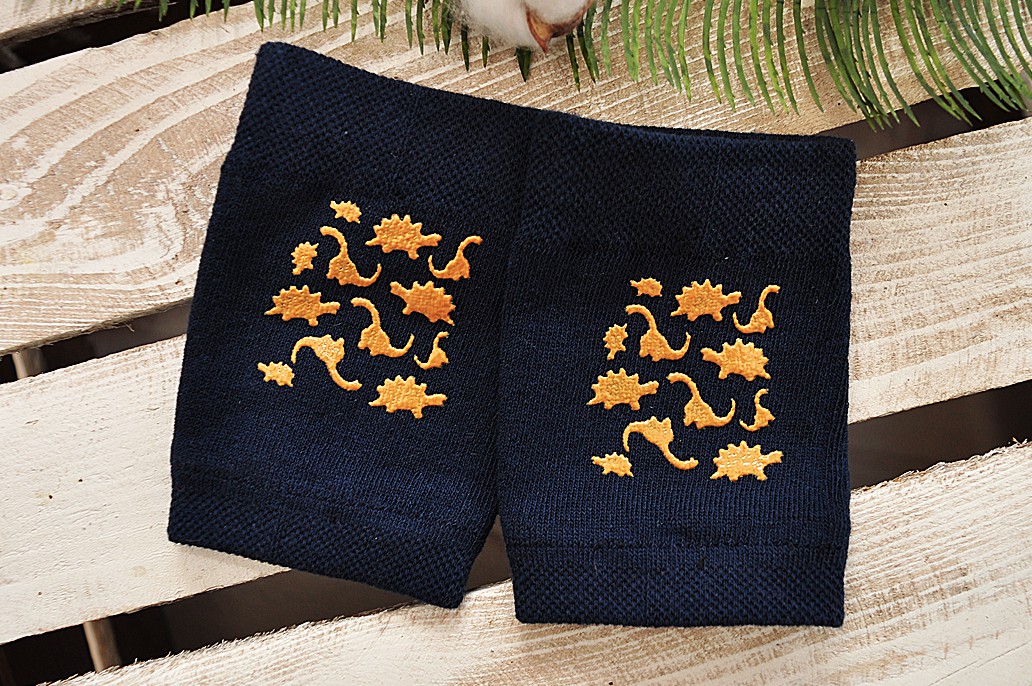 Nakolanniki do raczkowania w kolorze granatowym z ABS w kształcie dinozaurów.