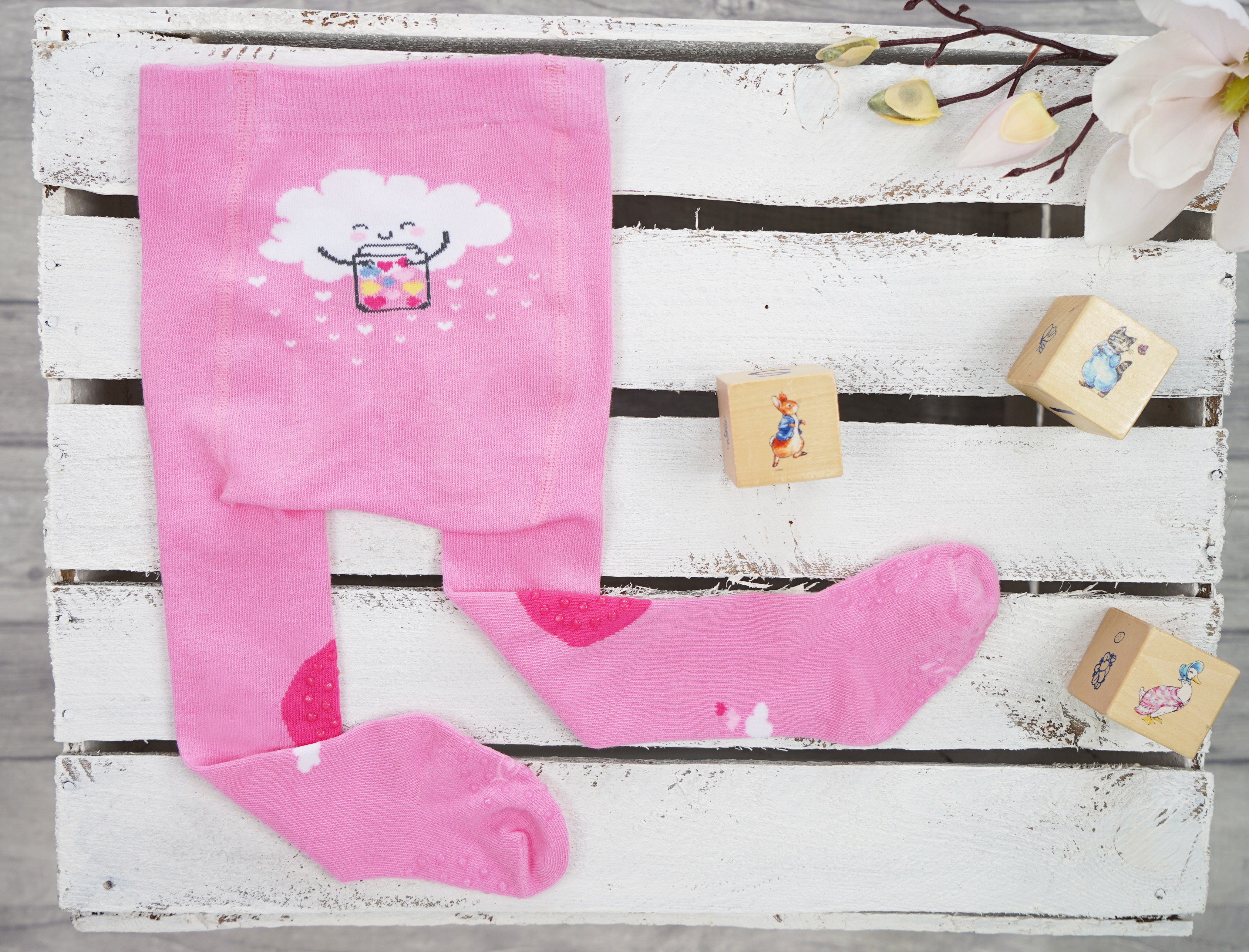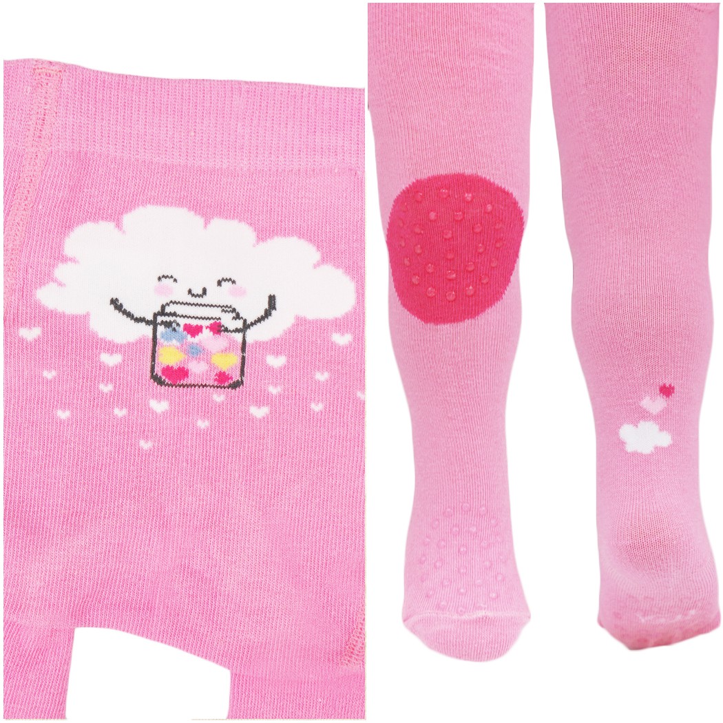Różowe rajstopy dziewczęce do raczkowania z potrójnym ABSem z chmurką.