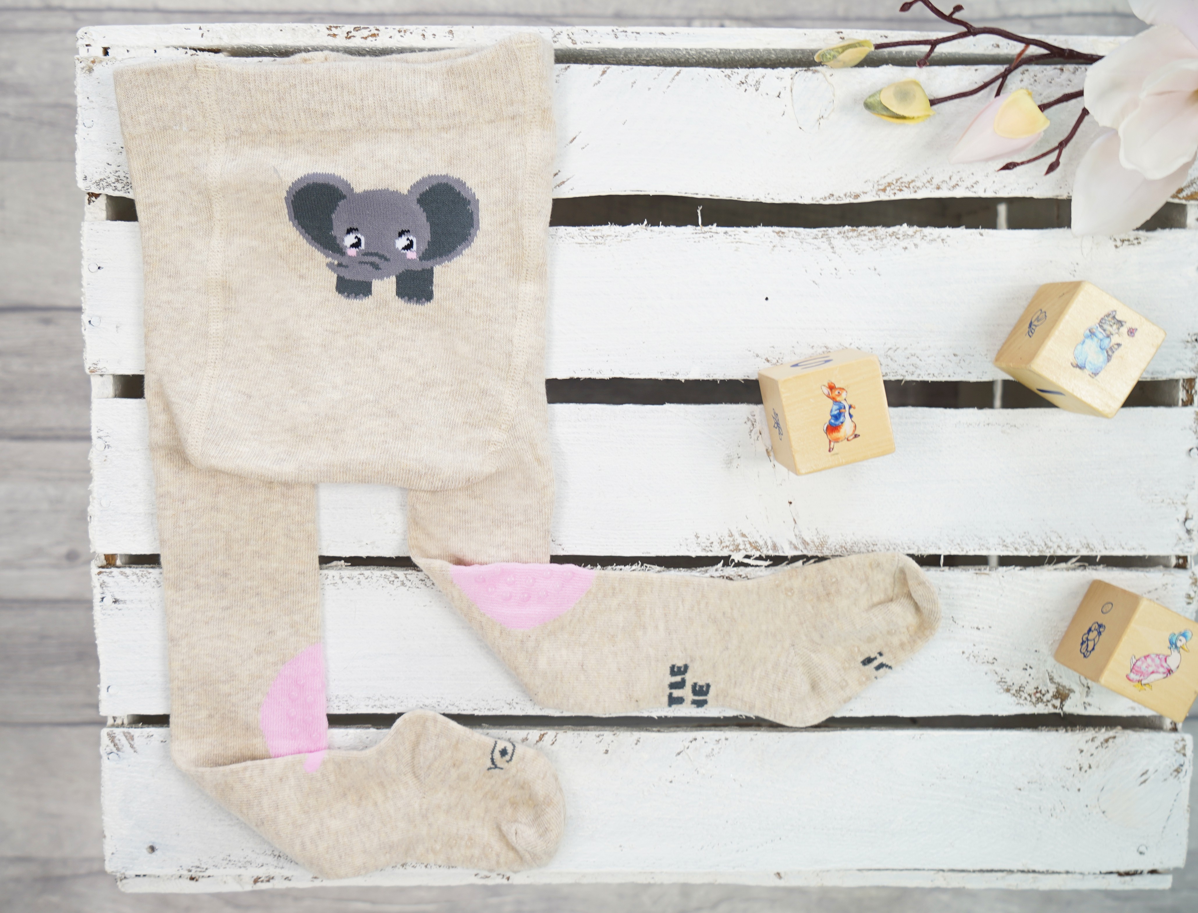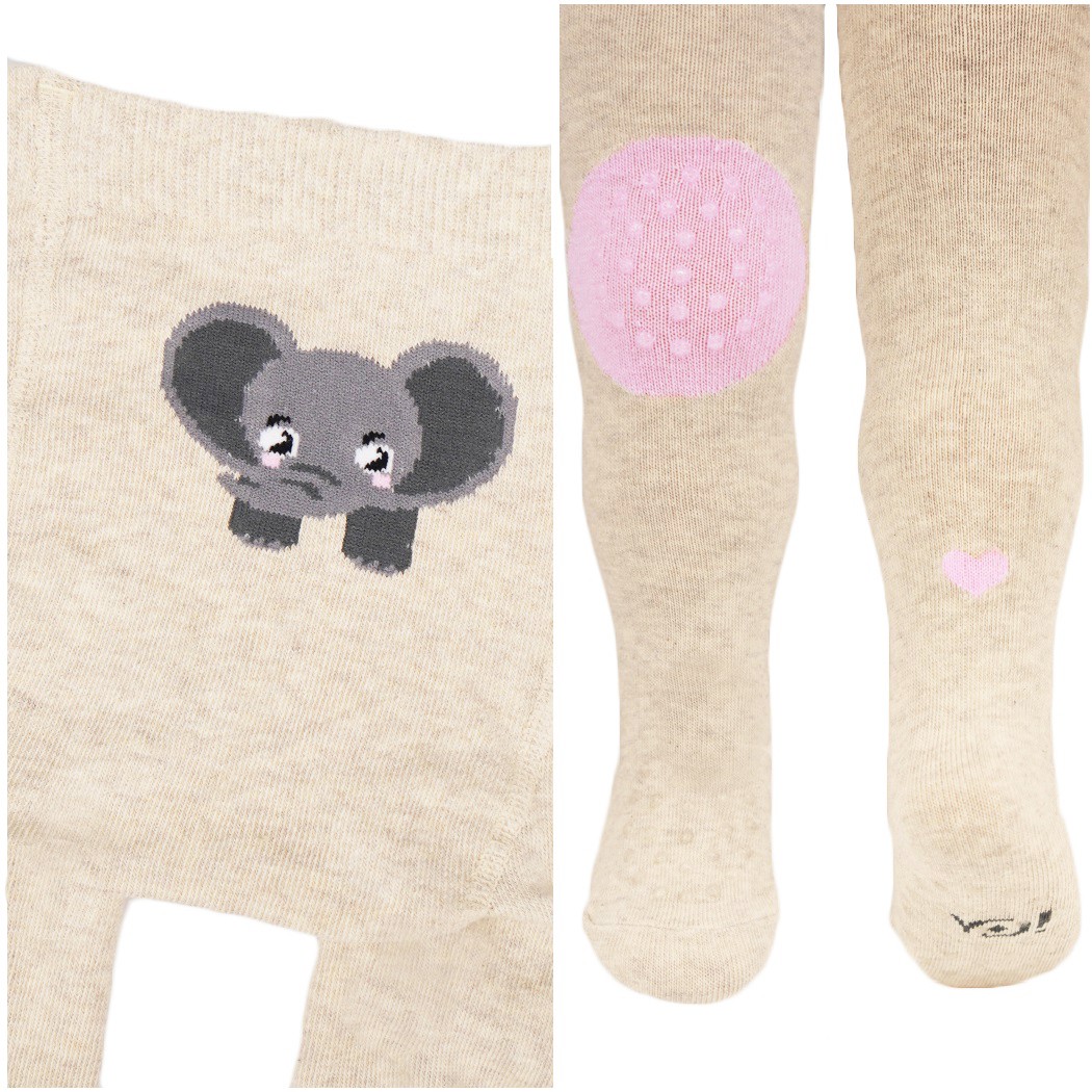 Beżowe rajstopy dziewczęce do raczkowania z potrójnym ABSem ze słonikiem.