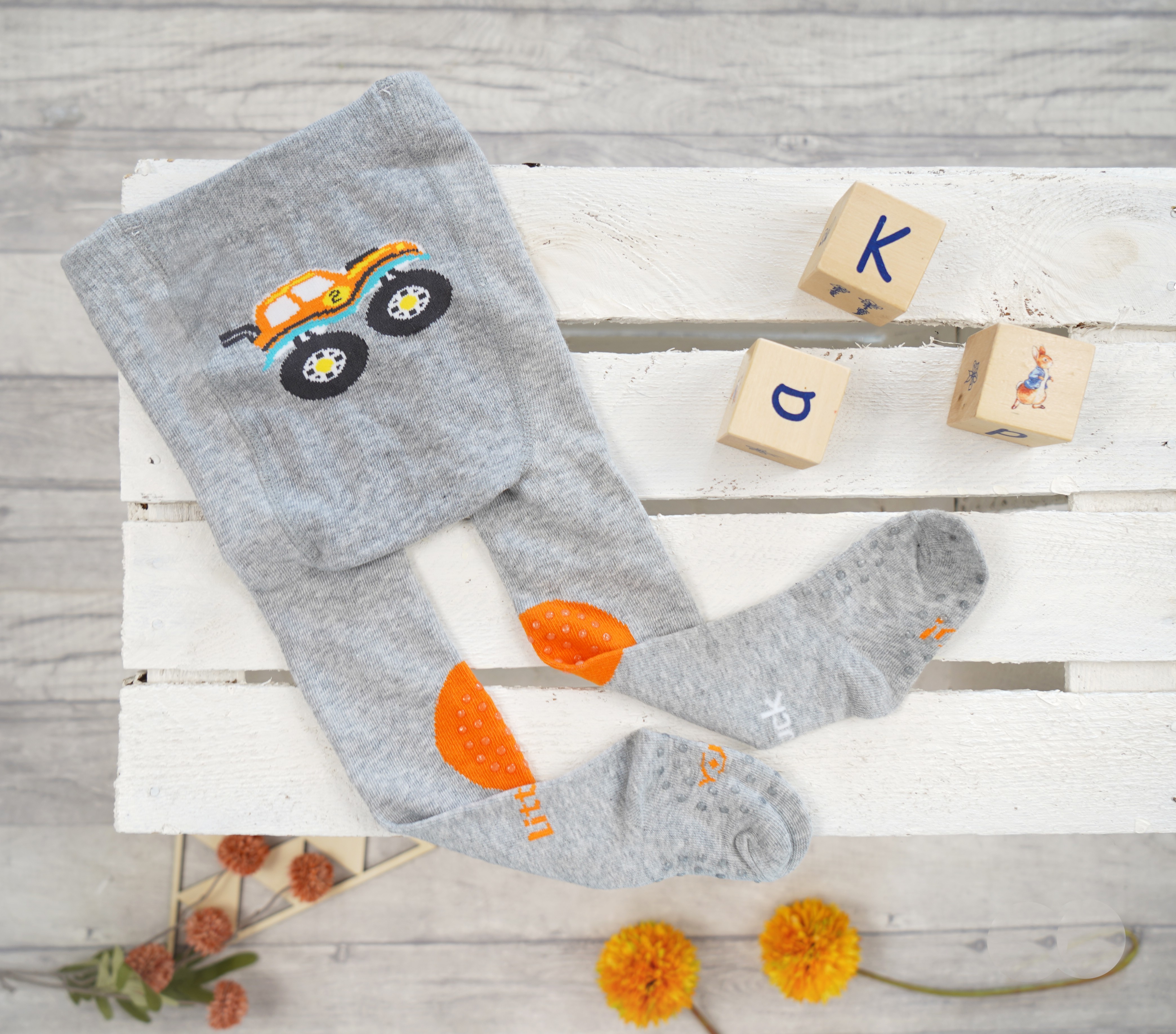Szare rajstopki do raczkowania z autem, które dobrze dopasowują się do ciała i nie krępują ruchów, dzięki czemu Twoja pociecha może brykać do woli. Antypoślizgowe gumowe kropeczki ABS na stopach z przodu i od spodu jak również na kolankach zapewniają świetną przyczepność na każdej powierzchni oraz pozwolą bezpiecznie poznawać otoczenie, a maluszek nie pościera sobie kolan.