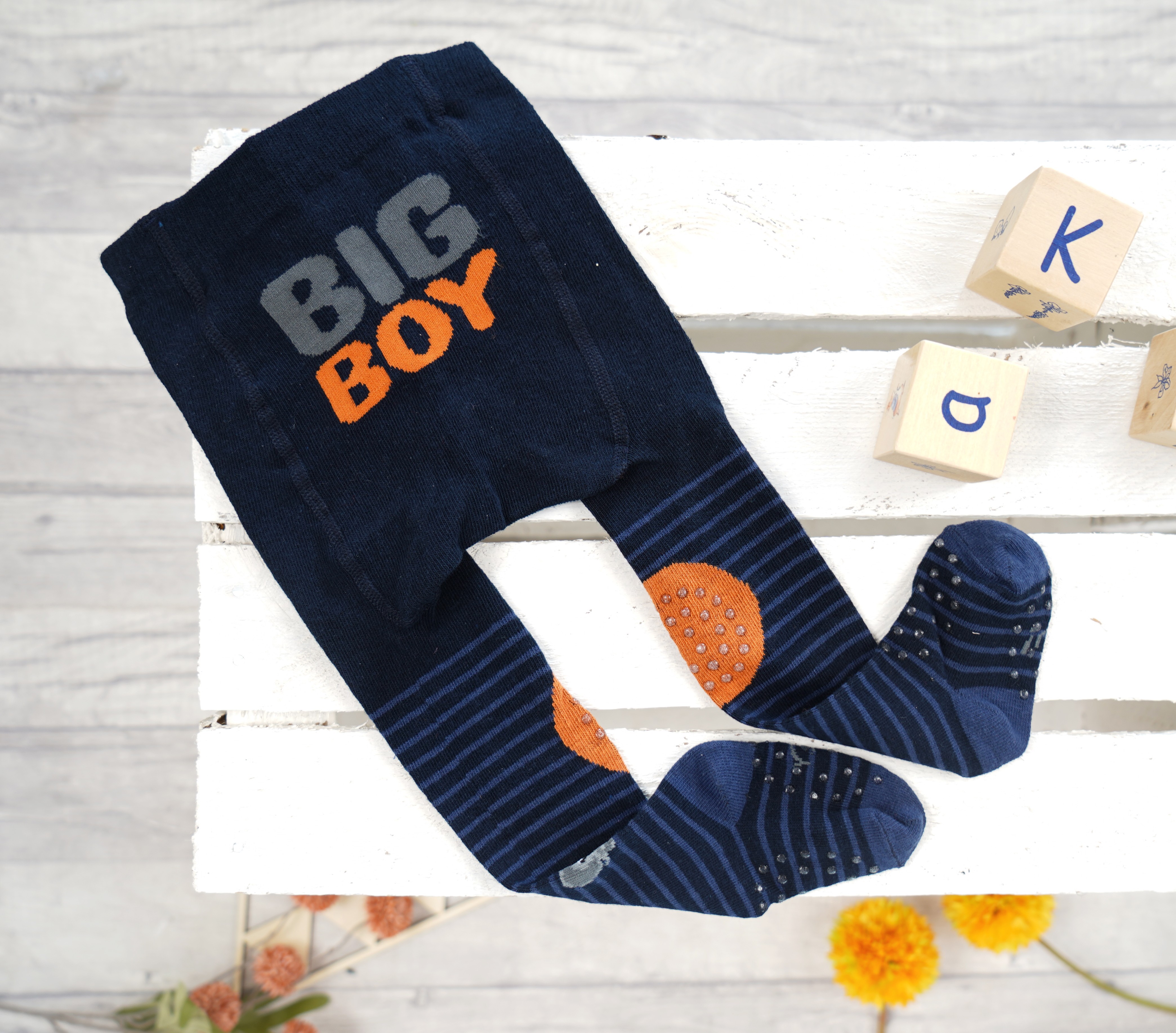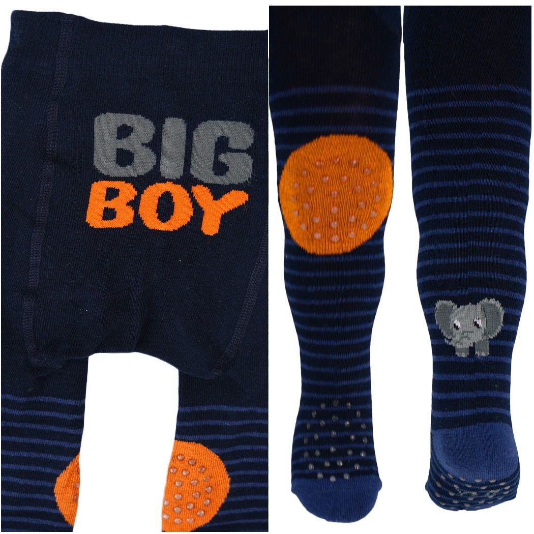 Granatowe rajstopy chłopięce do raczkowania z potrójnym ABSem z napisem.