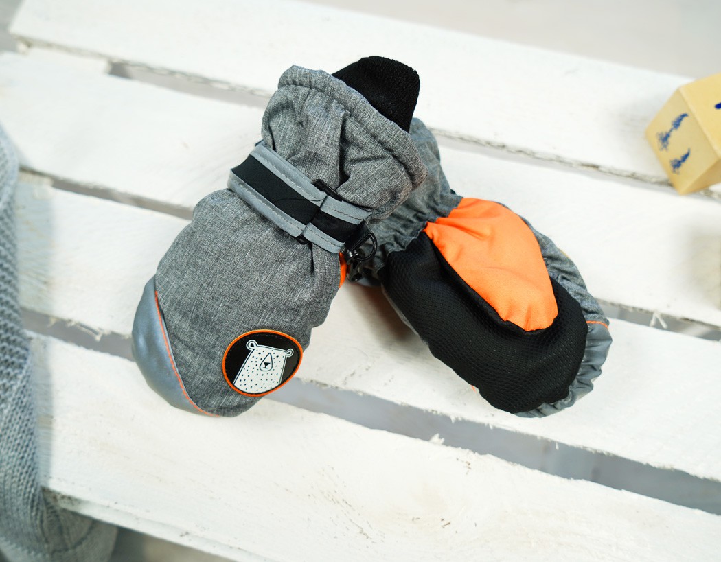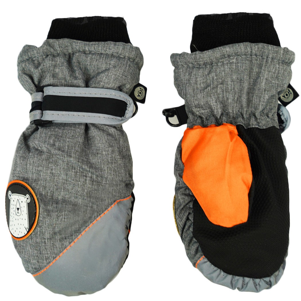 Grafitowo- pomarańczowe rękawiczki narciarskie z białym misiem.