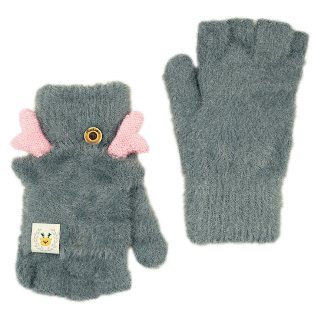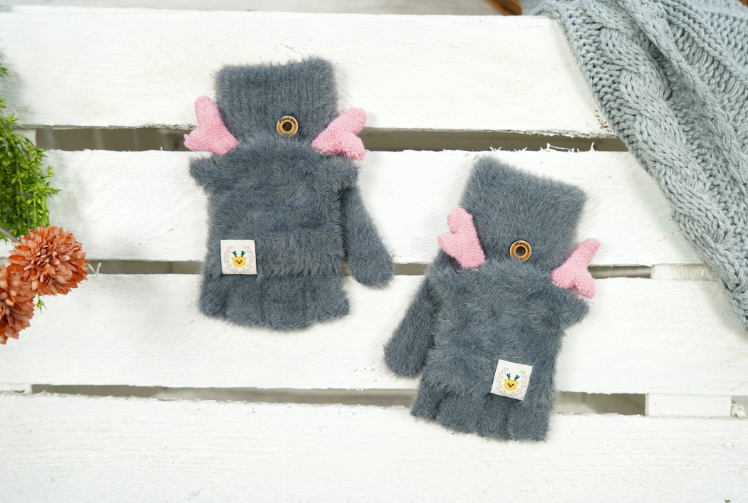 Rękawiczki bez palców, które po nałożeniu wewnętrznego kapturka stają się ciepłymi rękawiczkami z jednym palcem. Dostępne w ofercie rękawiczki dziewczęce przeznaczone są dla dzieci w wieku mniej więcej 5-15 lat. Na górnej części rękawiczek znajdują się dwa ozdobne rogi, podwijany kapturek wzbogaca urocza naszywka. Rękawiczki wykonane są z miękkiego, przyjemnego dla dłoni i ciepłego futerkowego materiału.