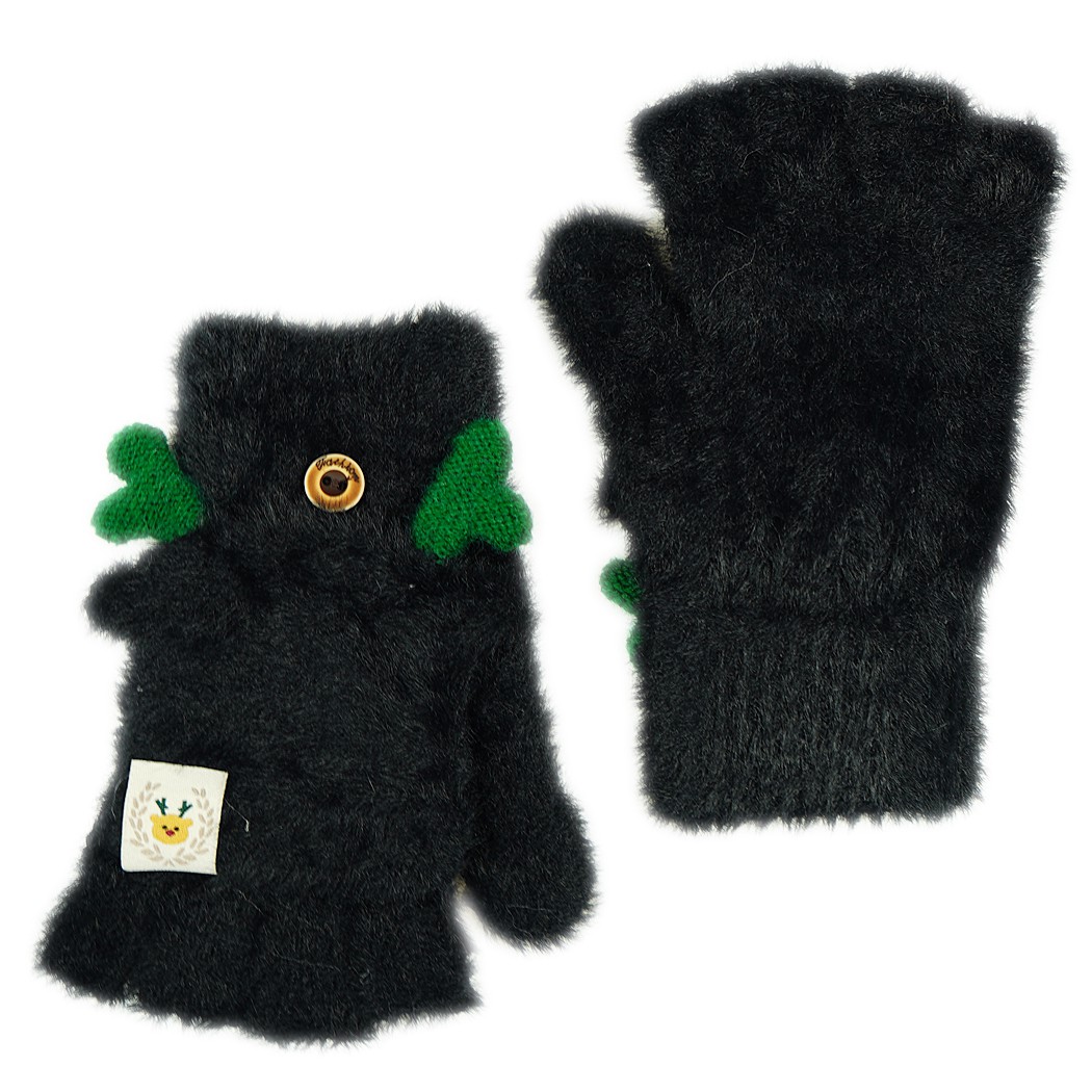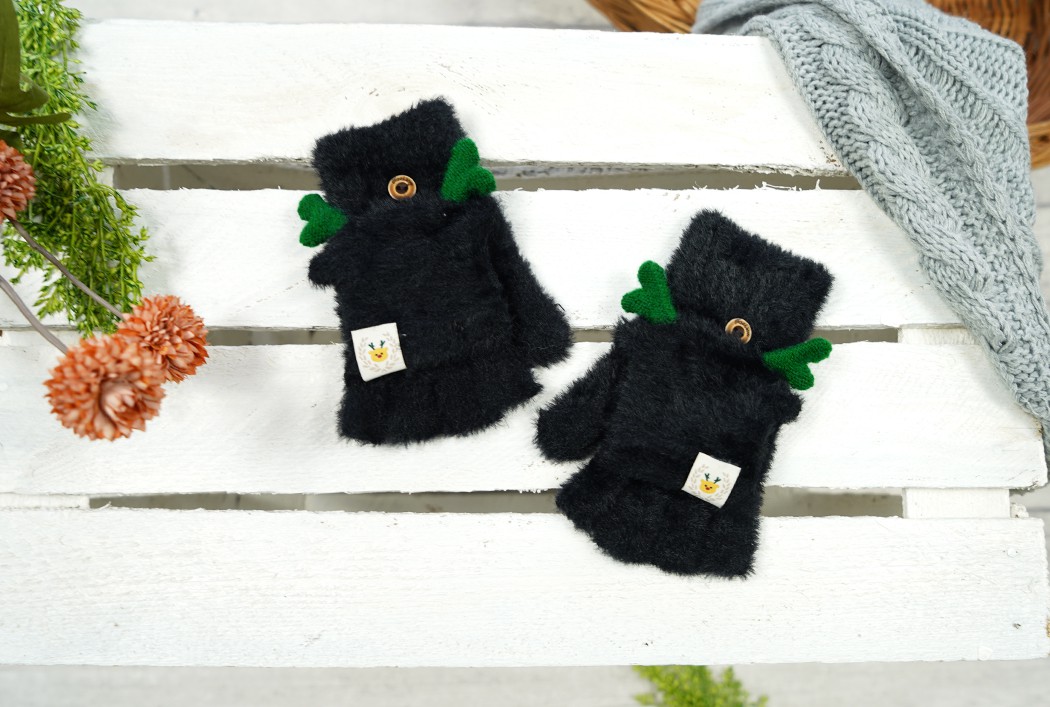 Czarne rękawiczki dla dziecka z kapturkiem i porożem renifera.