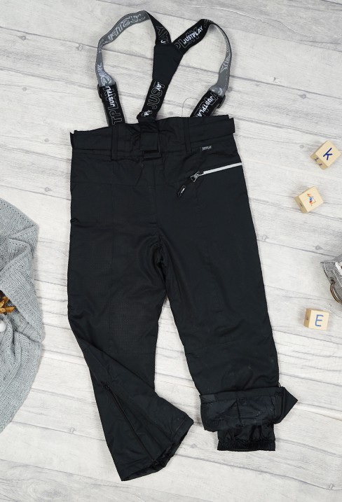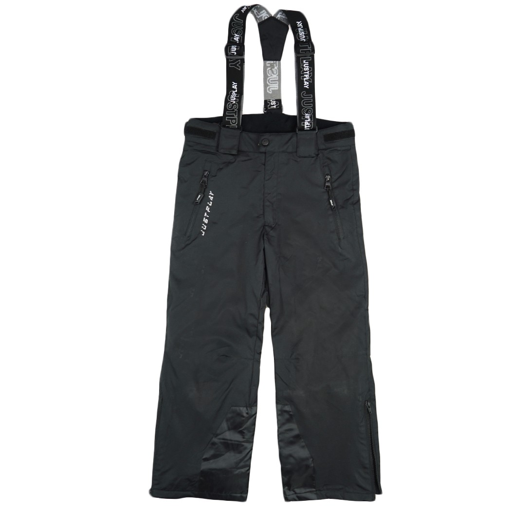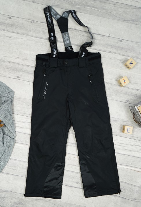 Nieprzemakalne spodnie typu narciarskiego. Spodnie posiadają zapięcie na suwak i klamrę oraz regulację na rzepy w pasie. Spodnie dziecięce wyposażone są regulowane szelki z możliwością odpięcia poprzez rzepy. Dół nogawek spodni został dodatkowo od środka wyposażony w nieprzemakalną nogawkę, która naciągnięta na obuwie chroni przed wodą i śniegiem. Nogawka ta posiada również wygodny suwak z boku. Spodnie narciarskie posiadają kieszenie boczne zamykane na nieprzemakalny suwak z wygodnym chwytakiem oraz jedną kieszeń tylną. Spodnie ozdobione na szelkach oraz przy jednej z kieszeni napisem: JustPlay