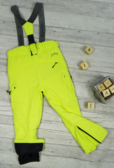 Nieprzemakalne spodnie typu narciarskiego. Spodnie posiadają zapięcie na suwak i klamrę oraz regulację na rzepy w pasie. Spodnie dziecięce wyposażone są regulowane szelki z możliwością odpięcia poprzez rzepy. Dół nogawek spodni został dodatkowo od środka wyposażony w nieprzemakalną nogawkę, która naciągnięta na obuwie chroni przed wodą i śniegiem. Nogawka ta posiada również wygodny suwak z boku. Spodnie narciarskie posiadają kieszenie boczne i jedną z tyłu, wszystkie zamykane na nieprzemakalny suwak z wygodnym chwytakiem. Spodnie ozdobione na szelkach oraz z tyłu niewielkim napisem: JustPlay