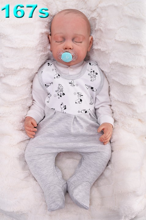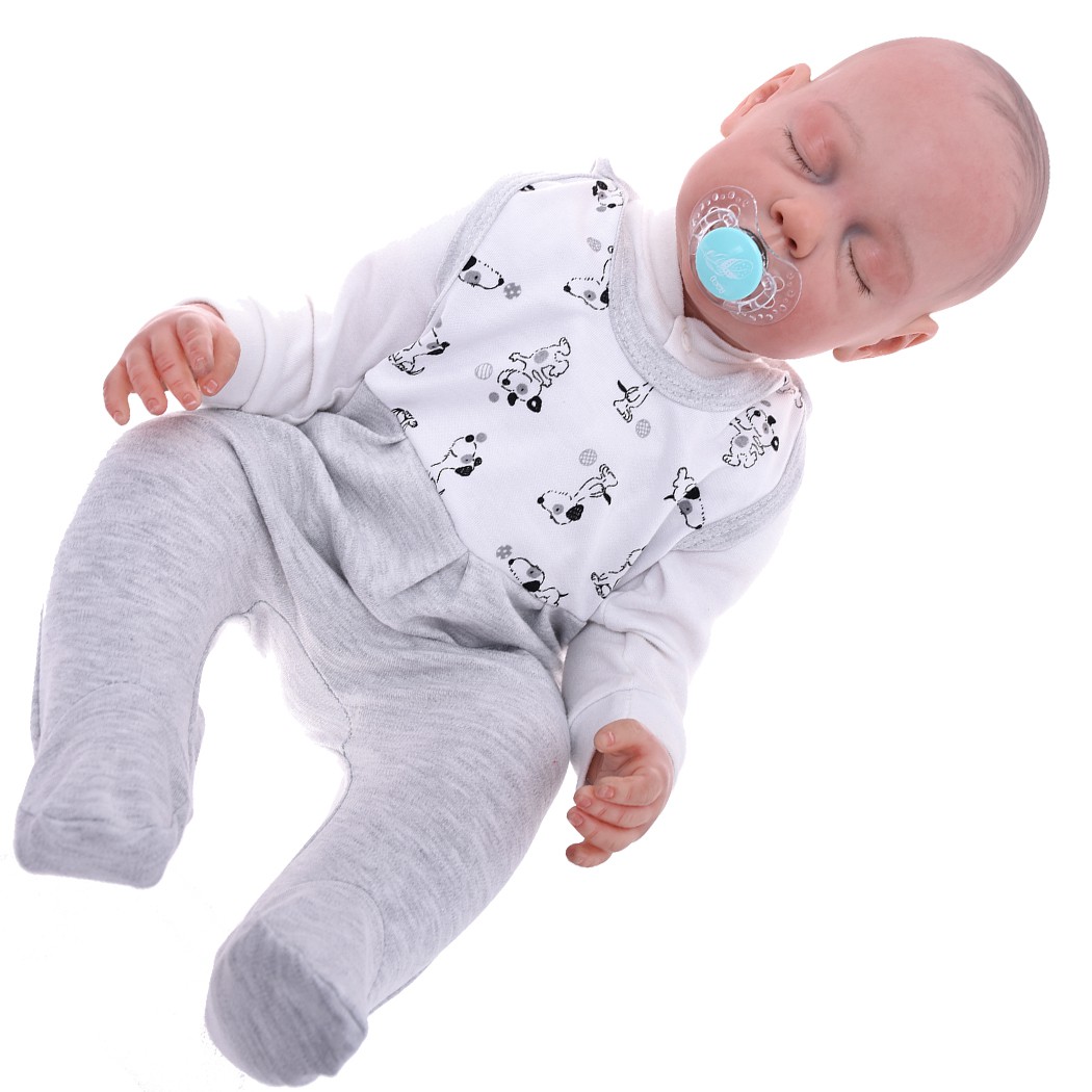 Śpiochy niemowlęce zapinane na ramionach na bezniklowe napki, uszyte z 100% bawełny w kolorze szarym. Z przodu góra śpioszków wykonana z białej bawełny drukowanej w pieski. Dostępne w ofercie klasyczne, przewiewne i wygodne śpioszki dla niemowlaka ze stópkami do codziennego użytku, jak i typowo do snu. Śpioszki niemowlęce są jednymi z najpopularniejszych ubranek dla małych dzieci. Lekkie, wygodne, łatwe do ubrania stanowią idealne rozwiązanie dla malucha, który nosi pieluchę.
