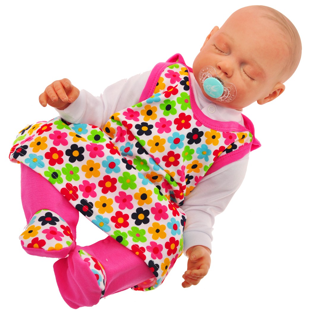 Dziewczęce śpiochy sukienka w kolorowe kwiaty zapinane na ramionach i w kroku na bezniklowe napki wykonane z miękkiego i przyjemnego w dotyku materiału, który po wielokrotnym praniu pozostaje w niezmienionym stanie. Góra śpioszków wykończona amarantową lamówką.