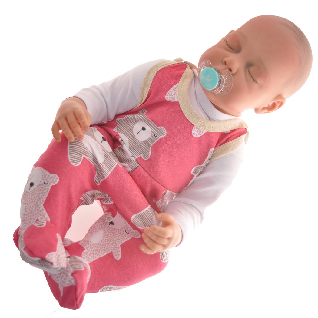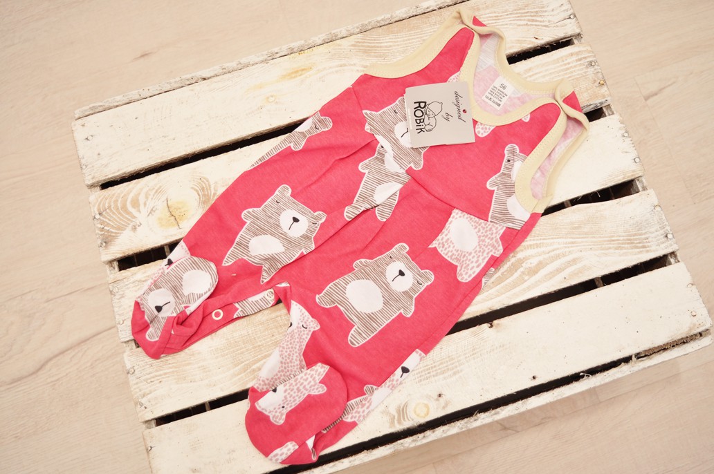 Śpiochy niemowlęce zapinane na ramionach i w kroku na bezniklowe napki wykonane z miękkiego i przyjemnego w dotyku materiału, który po wielokrotnym praniu pozostaje w niezmienionym stanie. Śpioszki bawełniane uszyte z malinowej dzianiny drukowanej w kolorowe misie wykończone bawełną w kolorze kremowym.