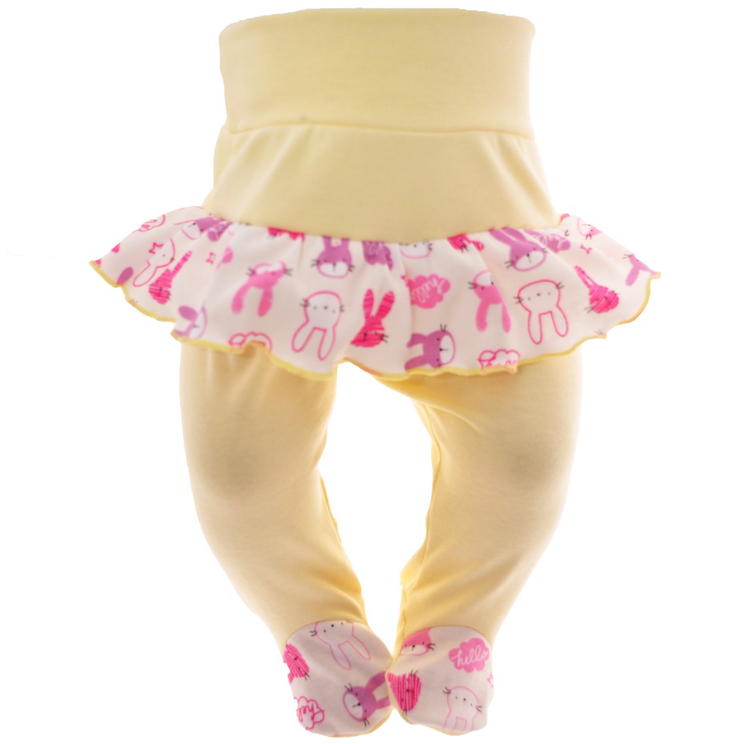 Żółte półśpioszki dla dziewczynki z falbanką z nadrukiem różowych króliczków.