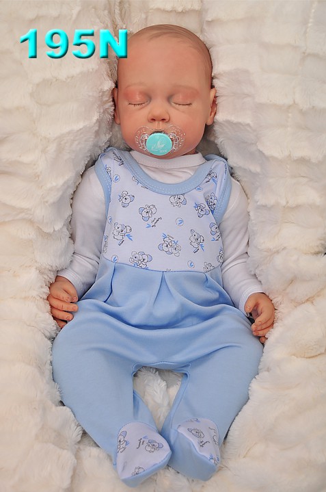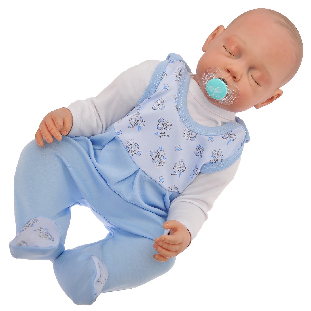 Śpiochy niemowlęce zapinane na ramionach na bezniklowe napki, uszyte z 100% bawełny w kolorze niebieskim. Z przodu góra śpioszków wykonana z jasno niebieskiej bawełny drukowanej w misie koala. Dostępne w ofercie klasyczne, przewiewne i wygodne śpioszki dla niemowlaka ze stópkami do codziennego użytku, jak i typowo do snu. Śpioszki niemowlęce są jednymi z najpopularniejszych ubranek dla małych dzieci. Lekkie, wygodne, łatwe do ubrania stanowią idealne rozwiązanie dla malucha, który nosi pieluchę.