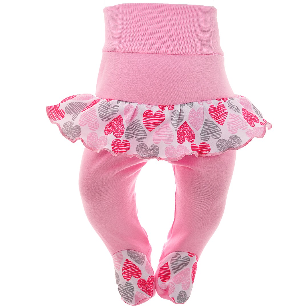 Różowe półśpioszki dla dziewczynki z falbanką z nadrukiem w serca.