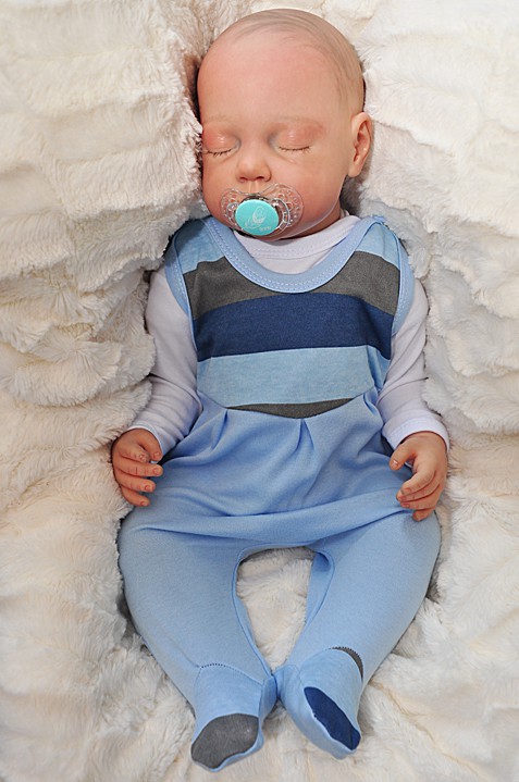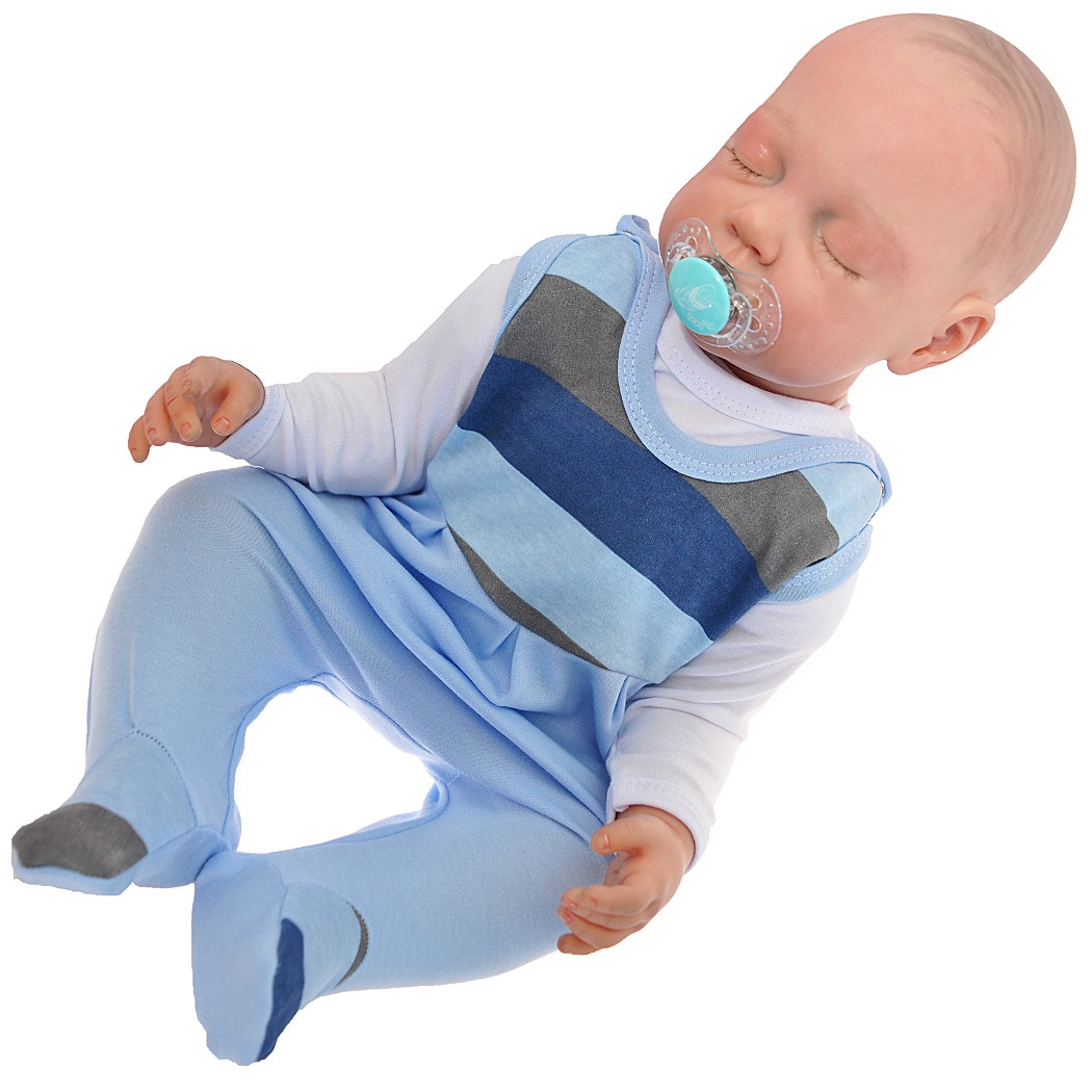Śpiochy niemowlęce zapinane na ramionach na bezniklowe napki, uszyte z 100% bawełny w kolorze niebieskim. Z przodu góra śpioszków wykonana z szarej bawełny drukowanej w paski. Dostępne w ofercie klasyczne, przewiewne i wygodne śpioszki dla niemowlaka ze stópkami do codziennego użytku, jak i typowo do snu. Śpioszki niemowlęce są jednymi z najpopularniejszych ubranek dla małych dzieci. Lekkie, wygodne, łatwe do ubrania stanowią idealne rozwiązanie dla malucha, który nosi pieluchę.