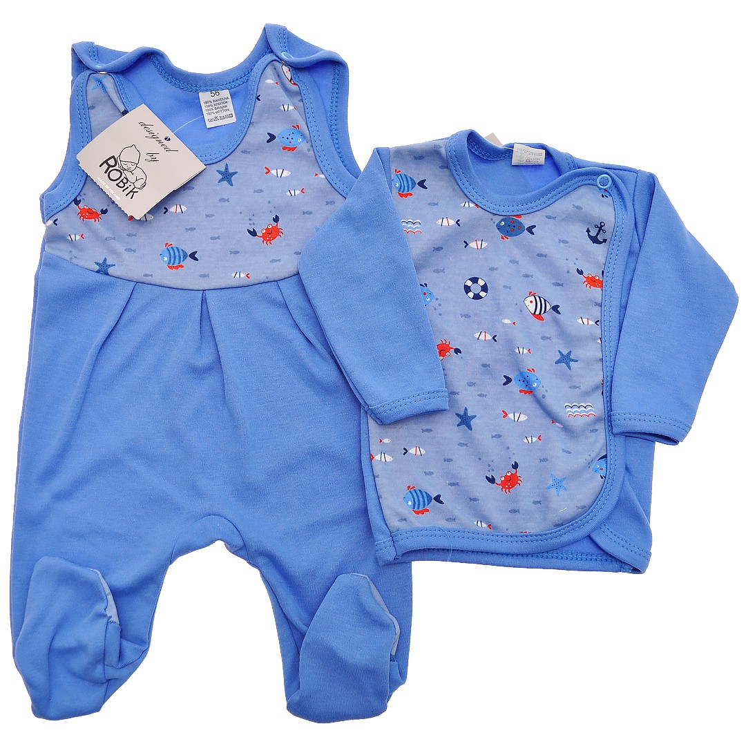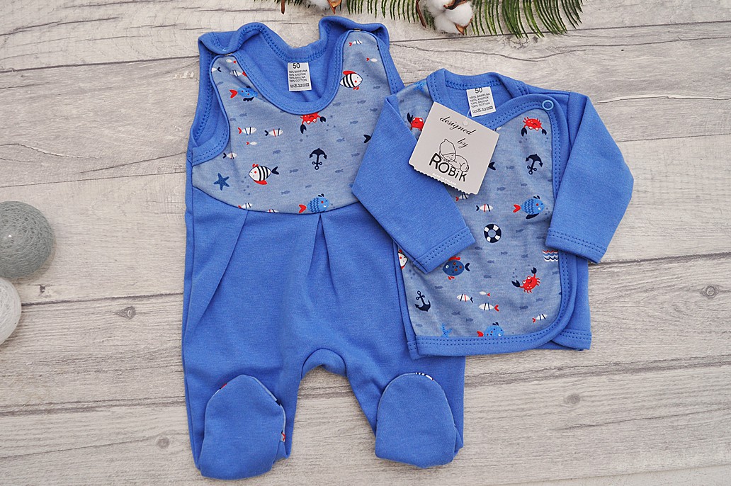 Niebieski komplet dla wczesniaka 2-częściowy z nadrukiem w morskim klimacie - śpiochy plus koszulka kopertowa.