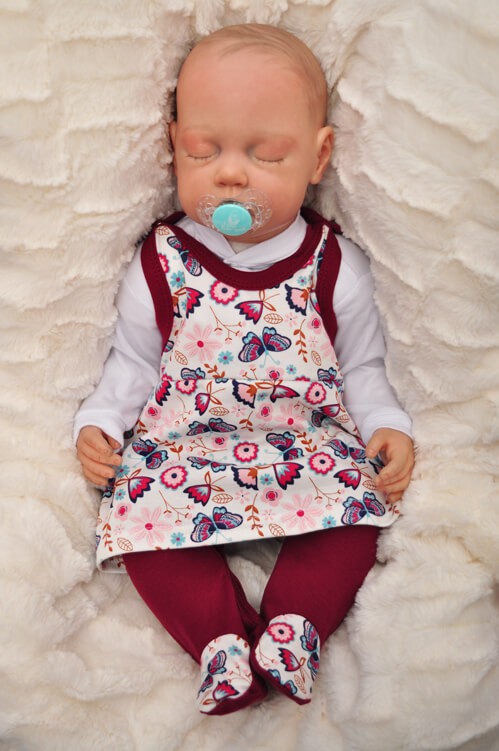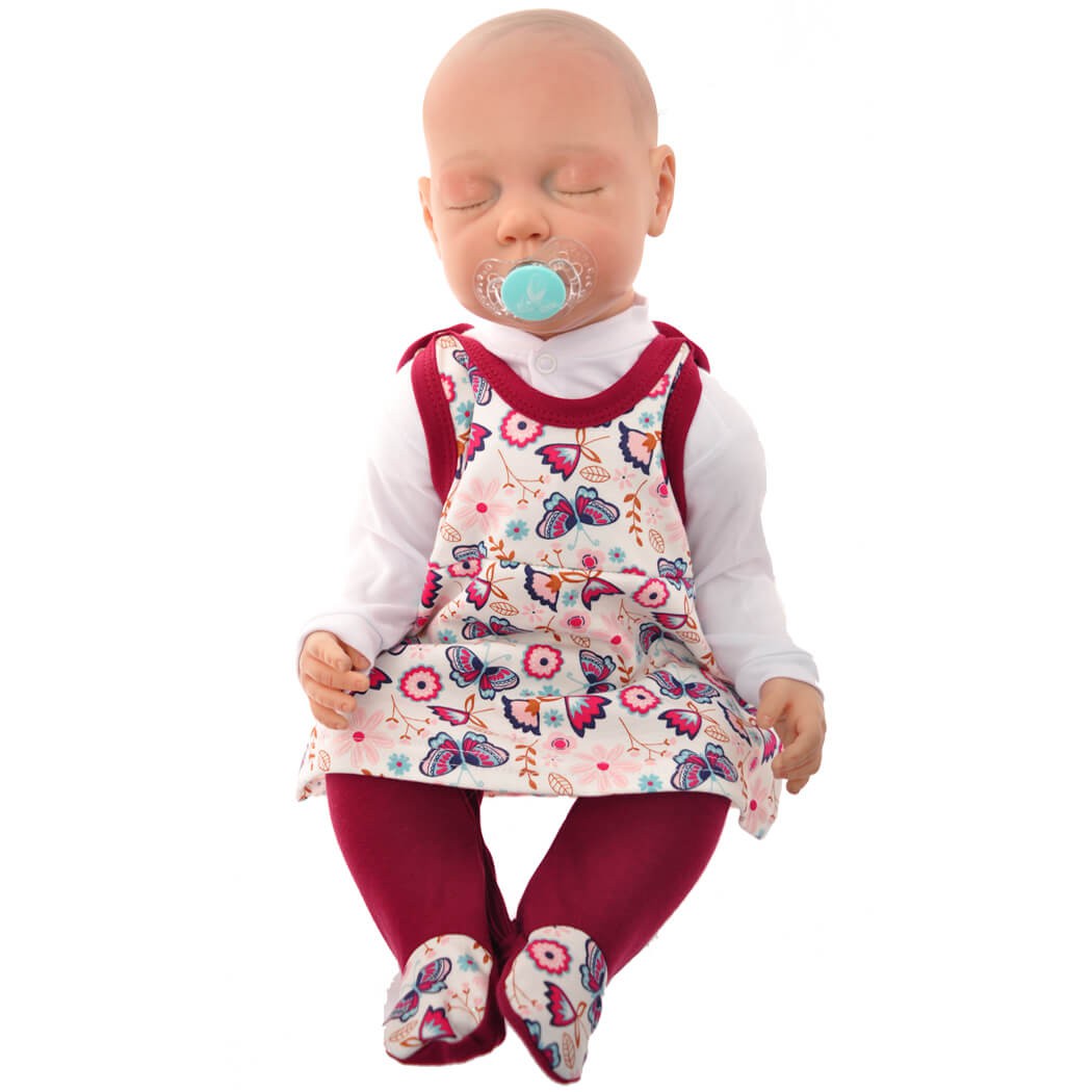 Biało bordowe śpiochy połączone z sukienką z nadrukiem w kwiaty i motyle.
