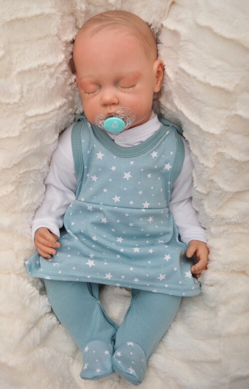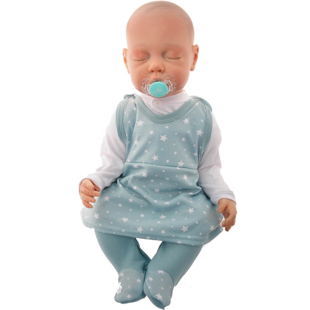 Szaro miętowe śpiochy połączone z sukienką z nadrukiem w gwiazdki.