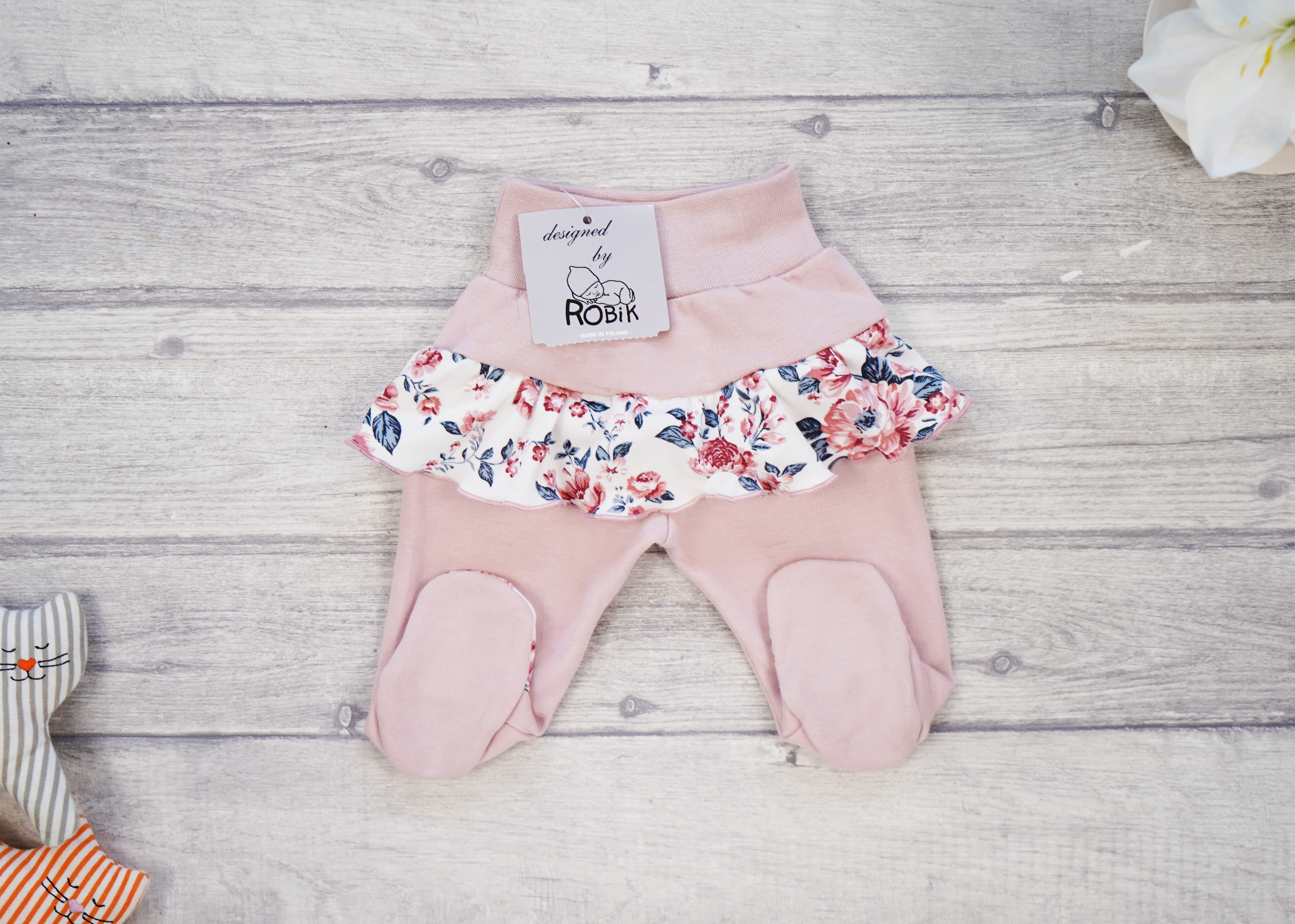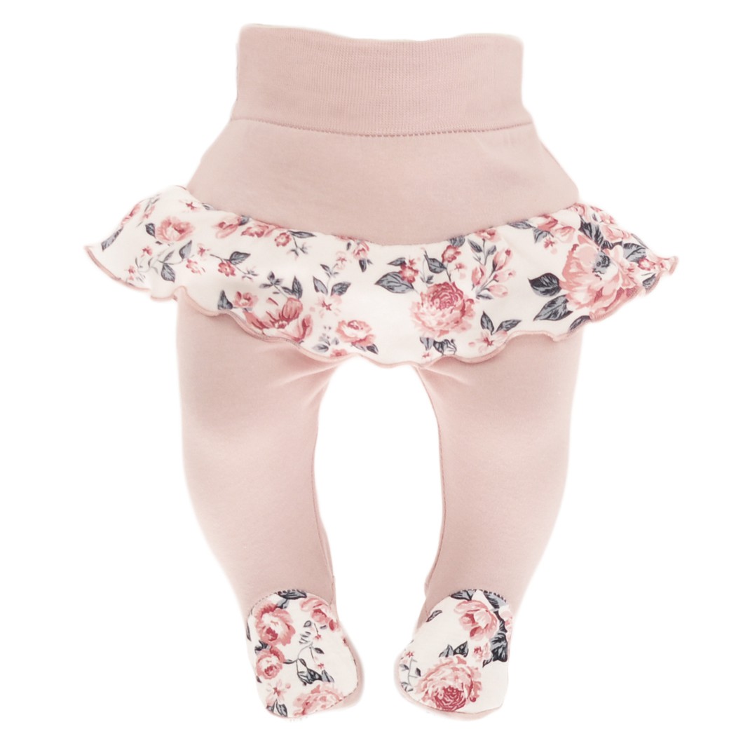 Półśpioszki dla dziewczynki z falbanką z nadrukiem w róże.