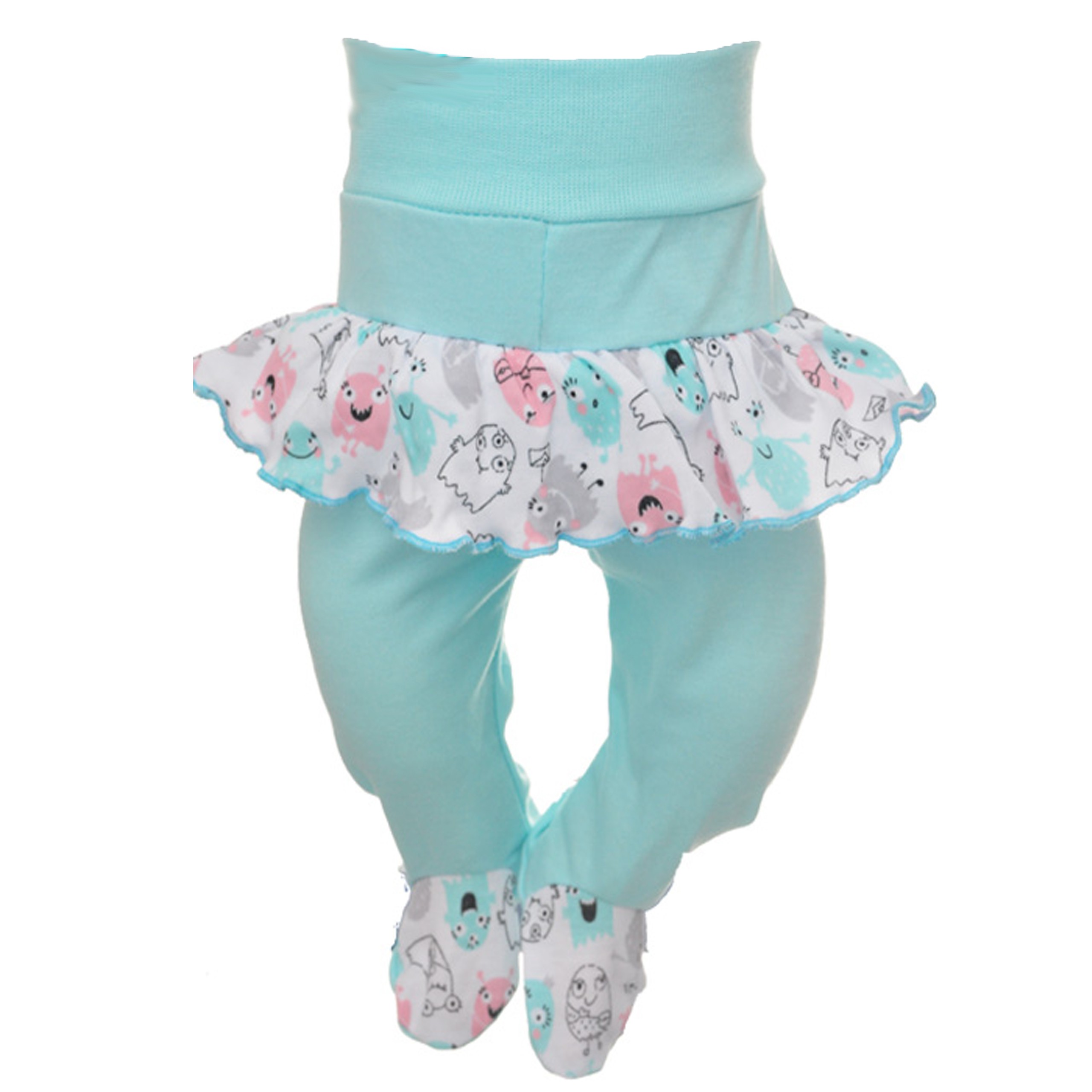Bezuciskowe półśpiochy niemowlęce wykonane z 100% bawełny w kolorze mietowym. Wyjątkową ozdobą tych dziewczęcych półśpiochów jest doszyta falbanka z nadrukiem w zabawne stworki. Dostępne w ofercie przewiewne i wygodne dziecięce półśpiochy ze stópkami posiadają szeroki ściągacz na brzuszku który nie uciska brzuszka niemowlaka dzięki temu Twoje dziecko uniknie bolesnych kolek.