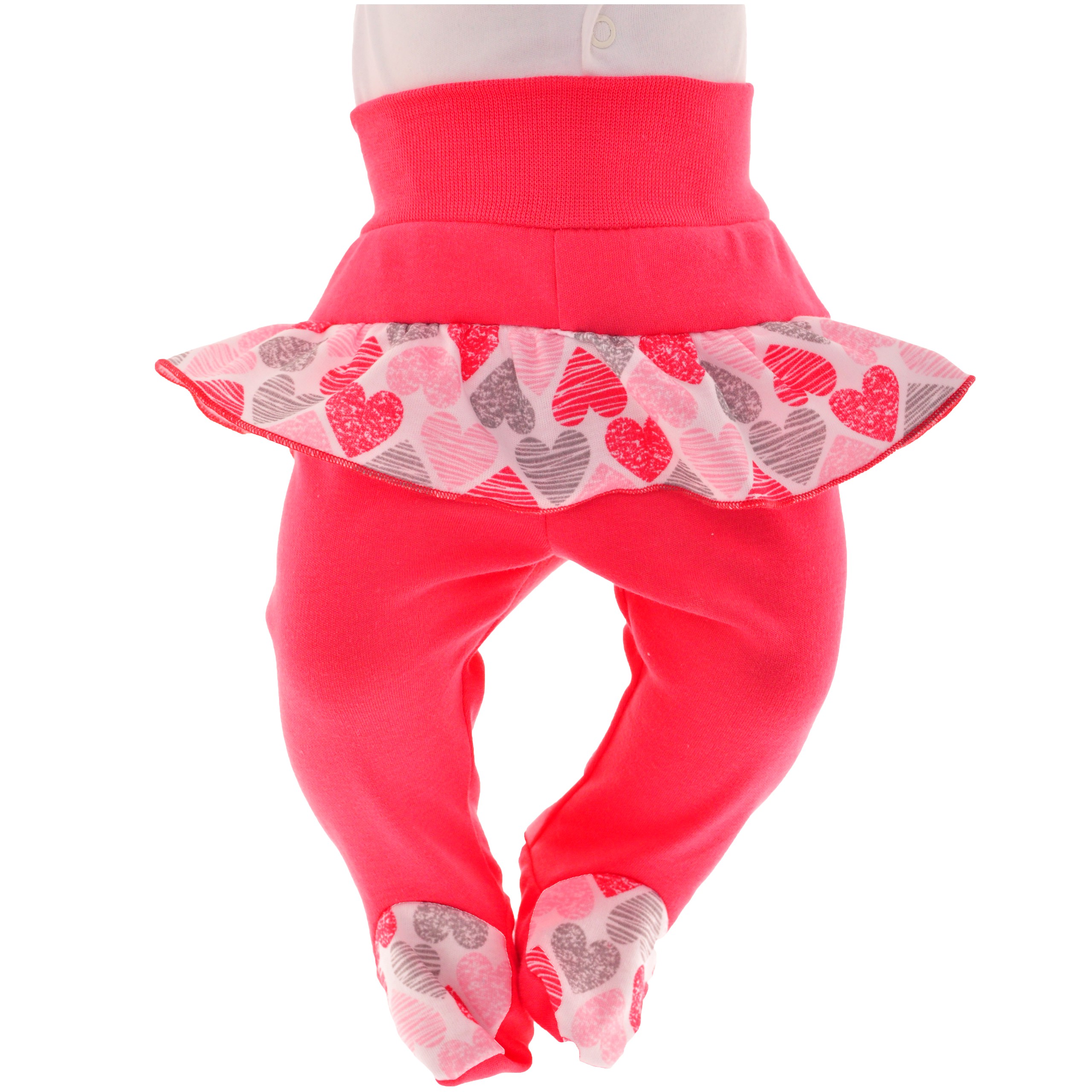 Bezuciskowe półśpiochy niemowlęce wykonane z 100% bawełny w kolorze malinowym. Wyjątkową ozdobą tych dziewczęcych półśpiochów jest doszyta falbanka z nadrukiem w serca. Dostępne w ofercie przewiewne i wygodne dziecięce półśpiochy ze stópkami posiadają szeroki ściągacz na brzuszku który nie uciska brzuszka niemowlaka dzięki temu Twoje dziecko uniknie bolesnych kolek.