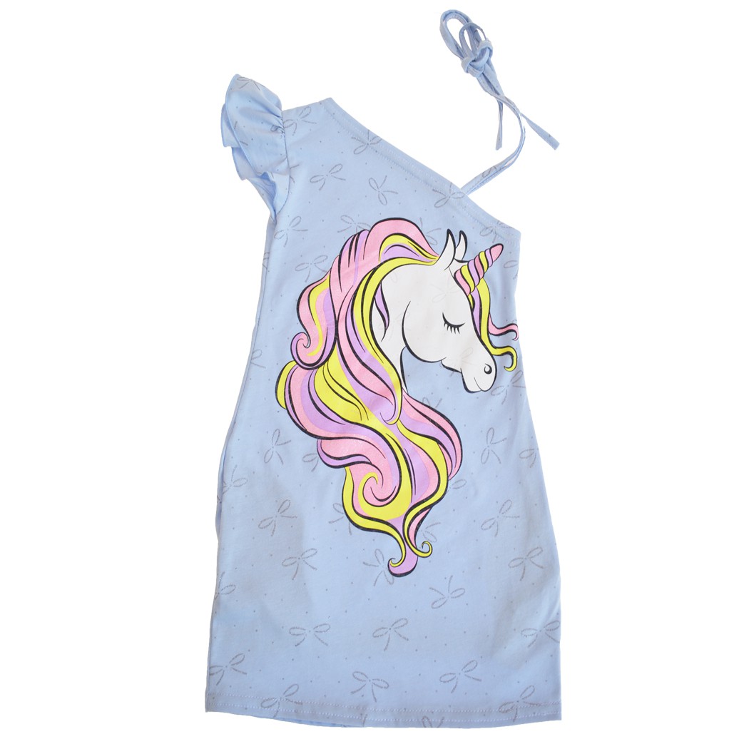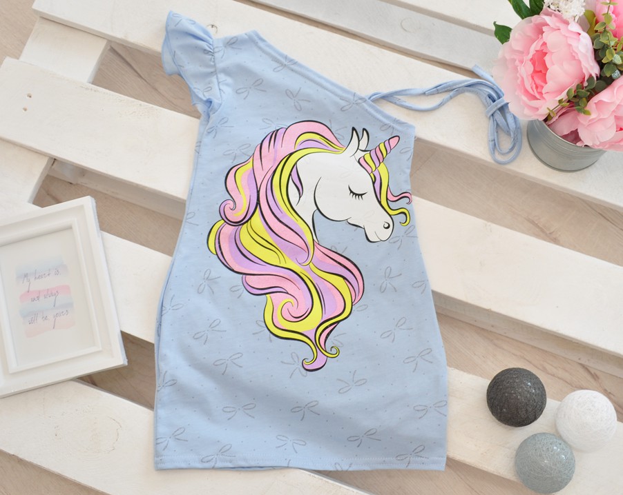 Dziewczęca sukienka na lato z nadrukiem jednorożca i brokatowymi kokardkami