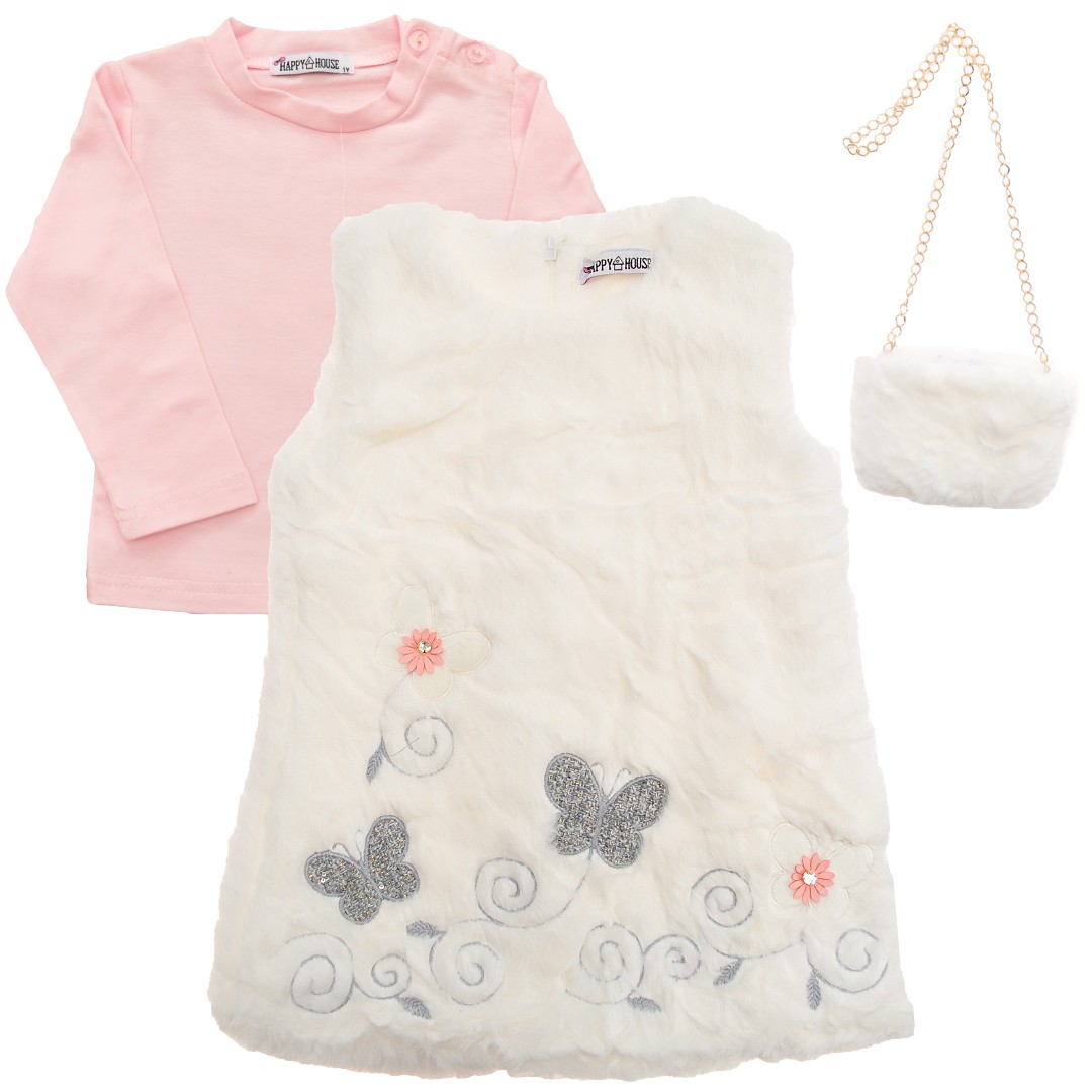 Zestaw dla dziewczynki 3-częściowy w skład którego wchodzą: ecru, futerkowa sukienka/tunika, różowa bluzeczka i futerkowa torebka.