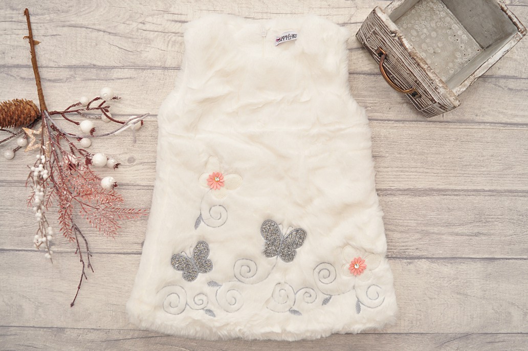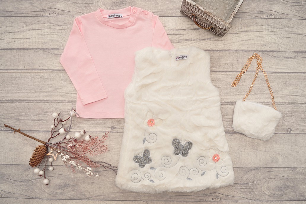 Ciepła sukienka/tunika dziewczęca bez rękawów w kolorze ecru uszyta z dzianiny typu futerko i podszyta od wewnątrz ciepłym ecru polarem. Główną ozdobą tej futerkowej sukienki są trójwymiarowe aplikacje motylków i kwiatów. Sukienka dziewczęca zapinana z tyłu na plecach na suwak w 3/4 długości sukienki. W skład tego kompletu dla dziewczynki wchodzi również różowa bluzeczka z długim rękawem zapinana na ramieniu na 2 guziki oraz ecru, futerkowa torebka na złotym łańcuszku. Torebka od wewnątrz obszyta ecru polarem i zapinana na rzepy.