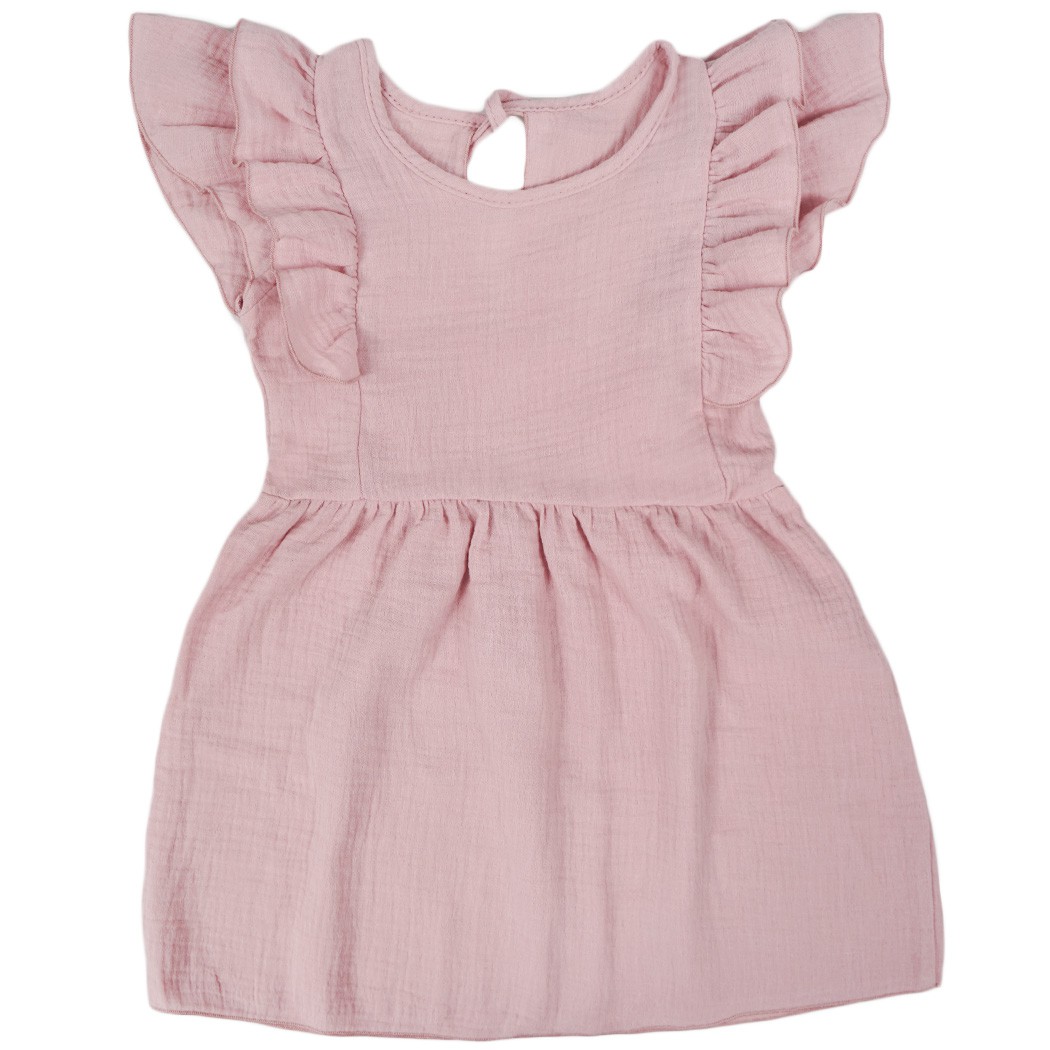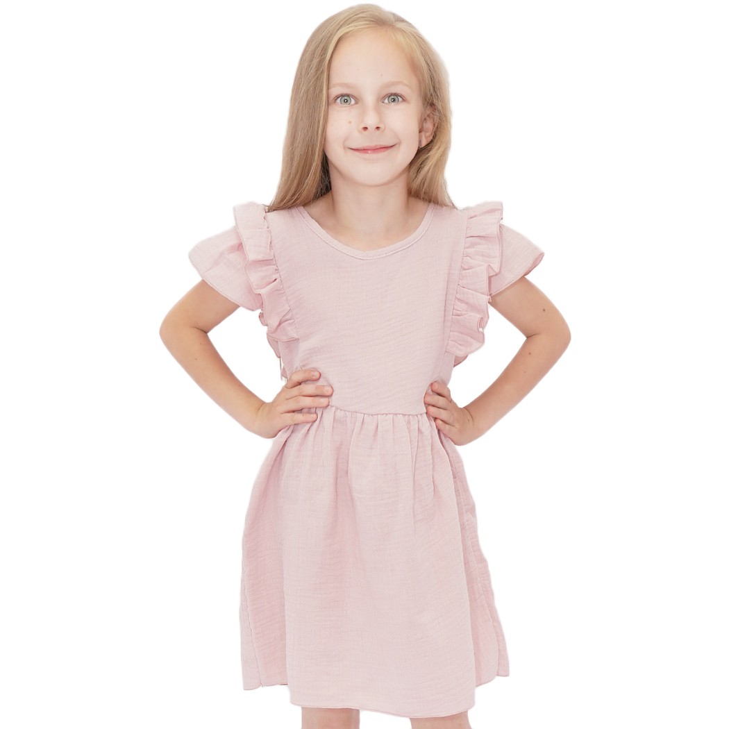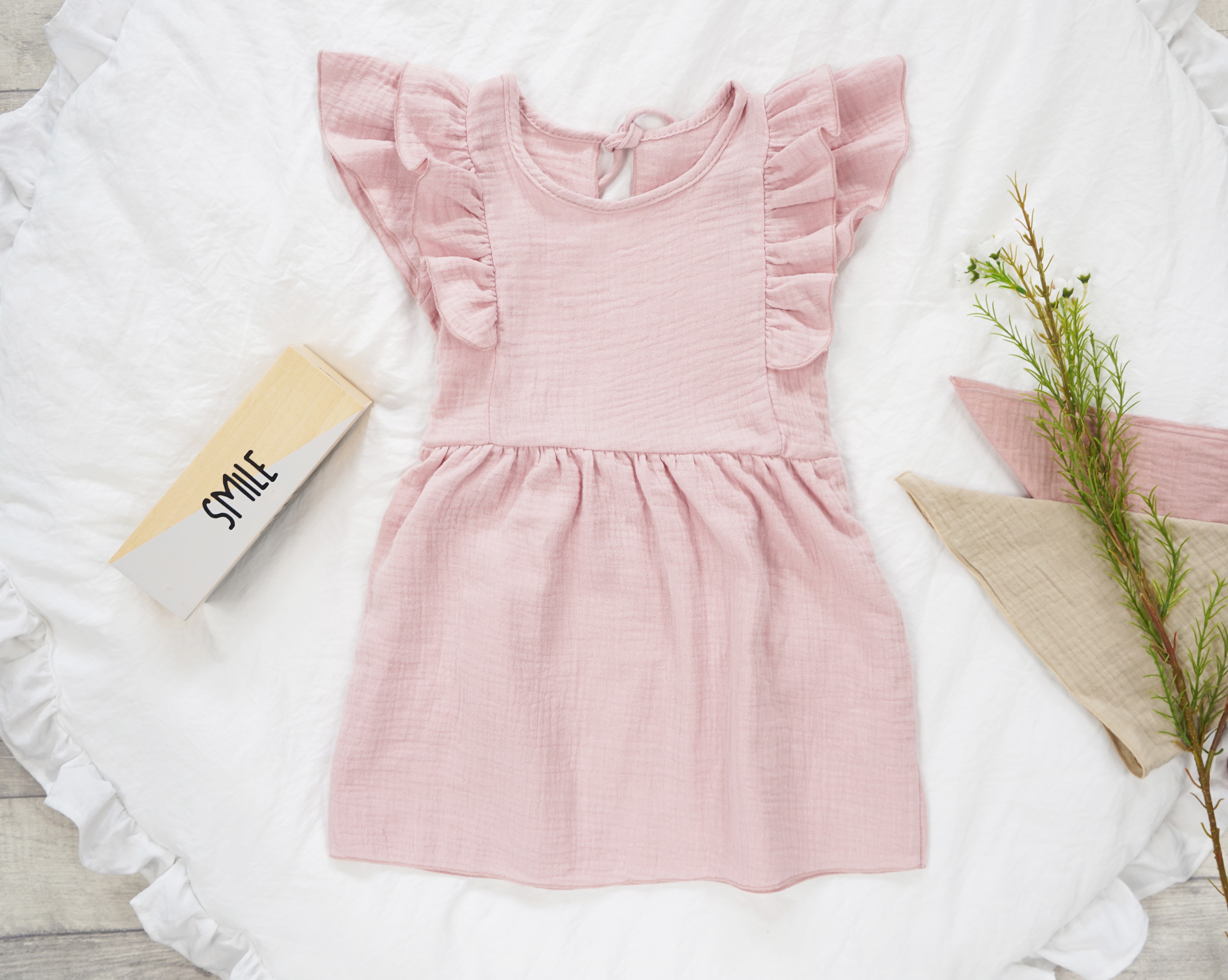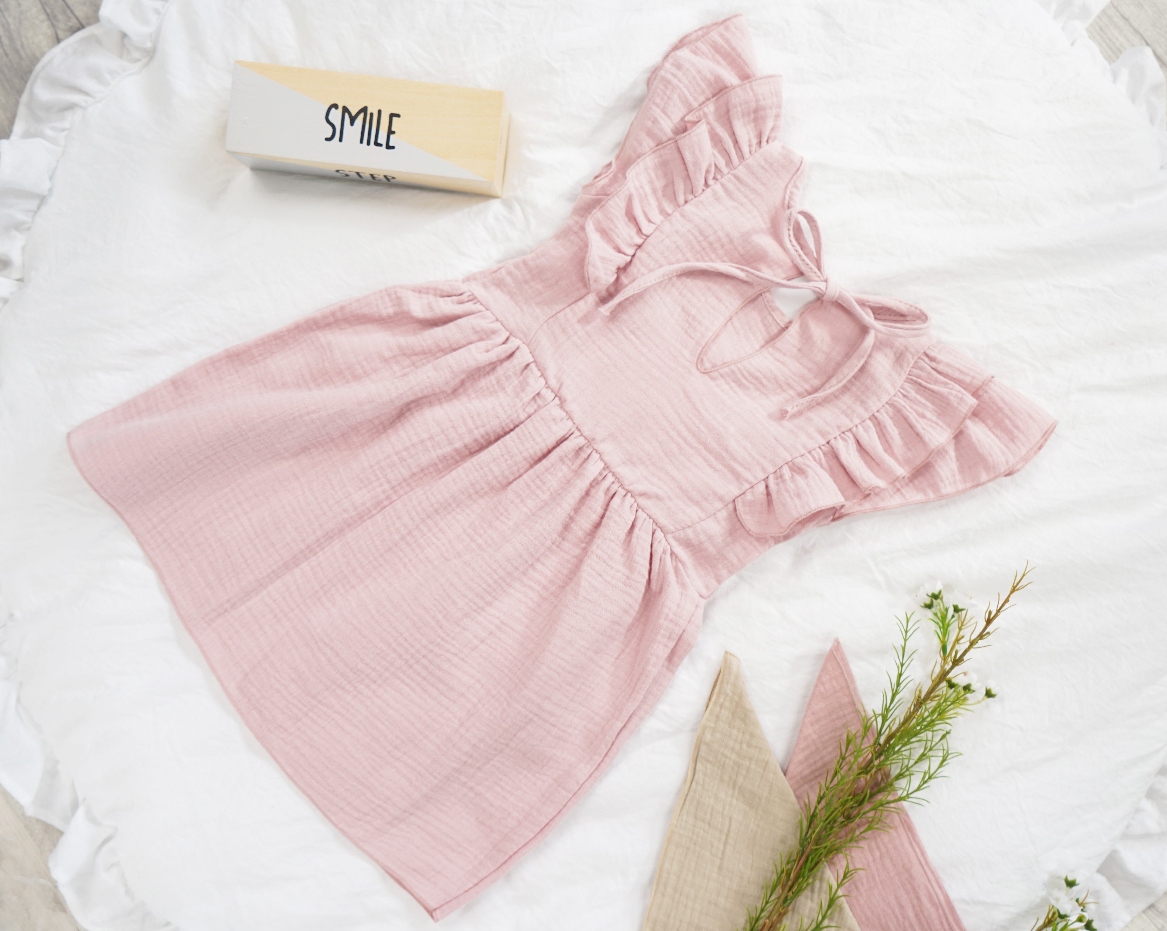 Sukienka ozdobiona falbankami na ramionach. Sukieneczka dla dziewczynki wciągana przez głowę i zawiązywana na karku z ozdobnym wycięciem na plecach. Przy szyjce wykończona delikatną lamówką. Uszyta z miękkiej i przyjemnej w dotyku bawełny muślinowej idealnej na letnie, upalne temperatury.