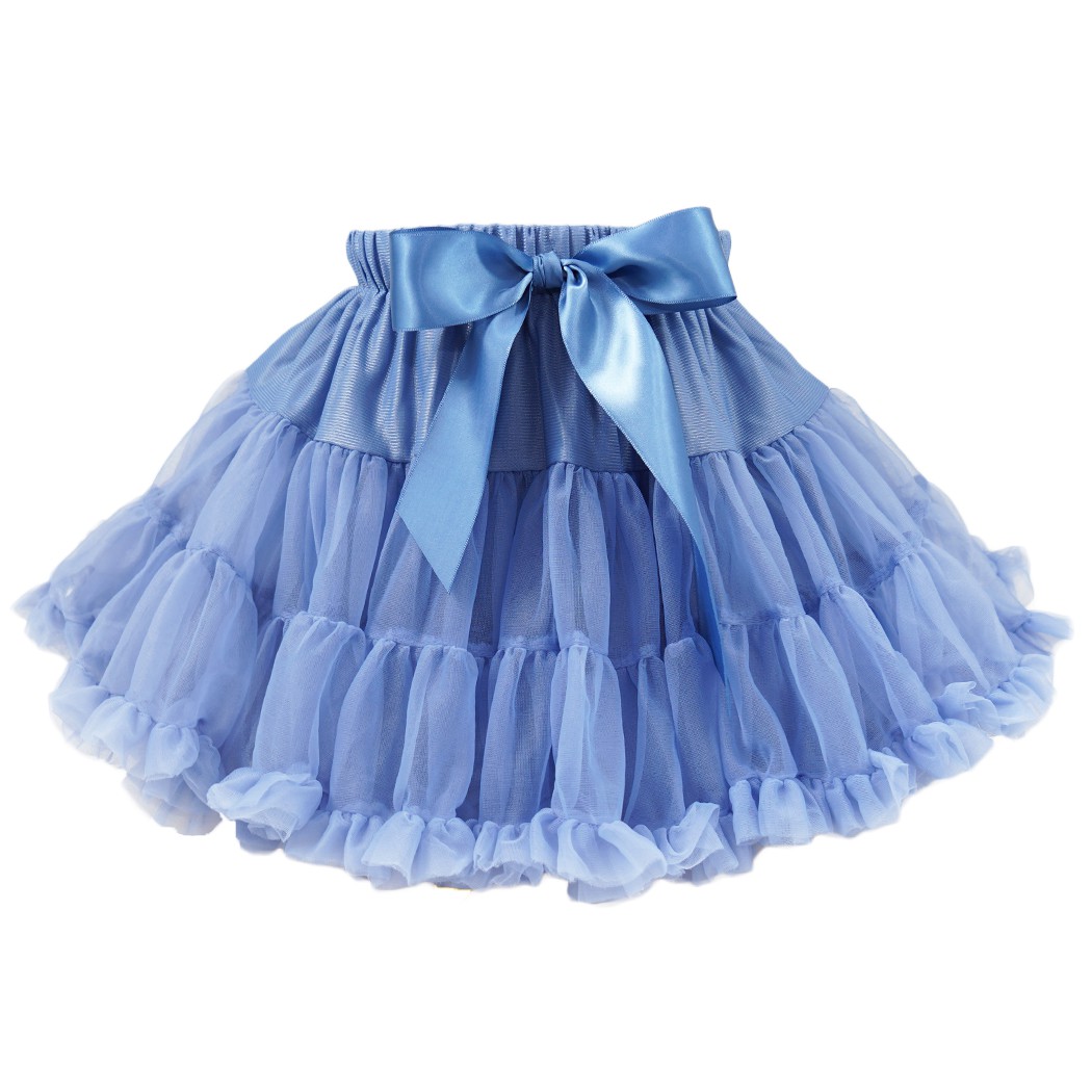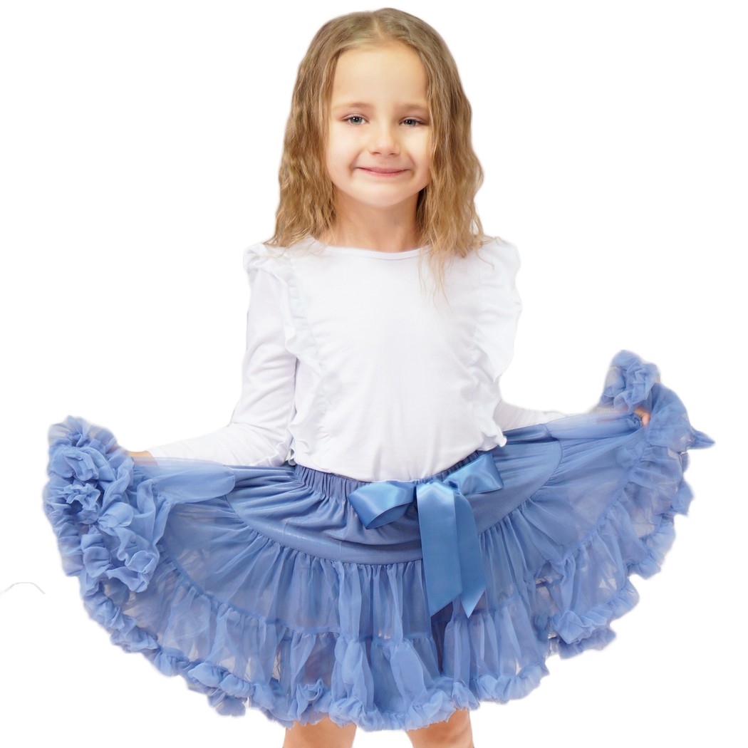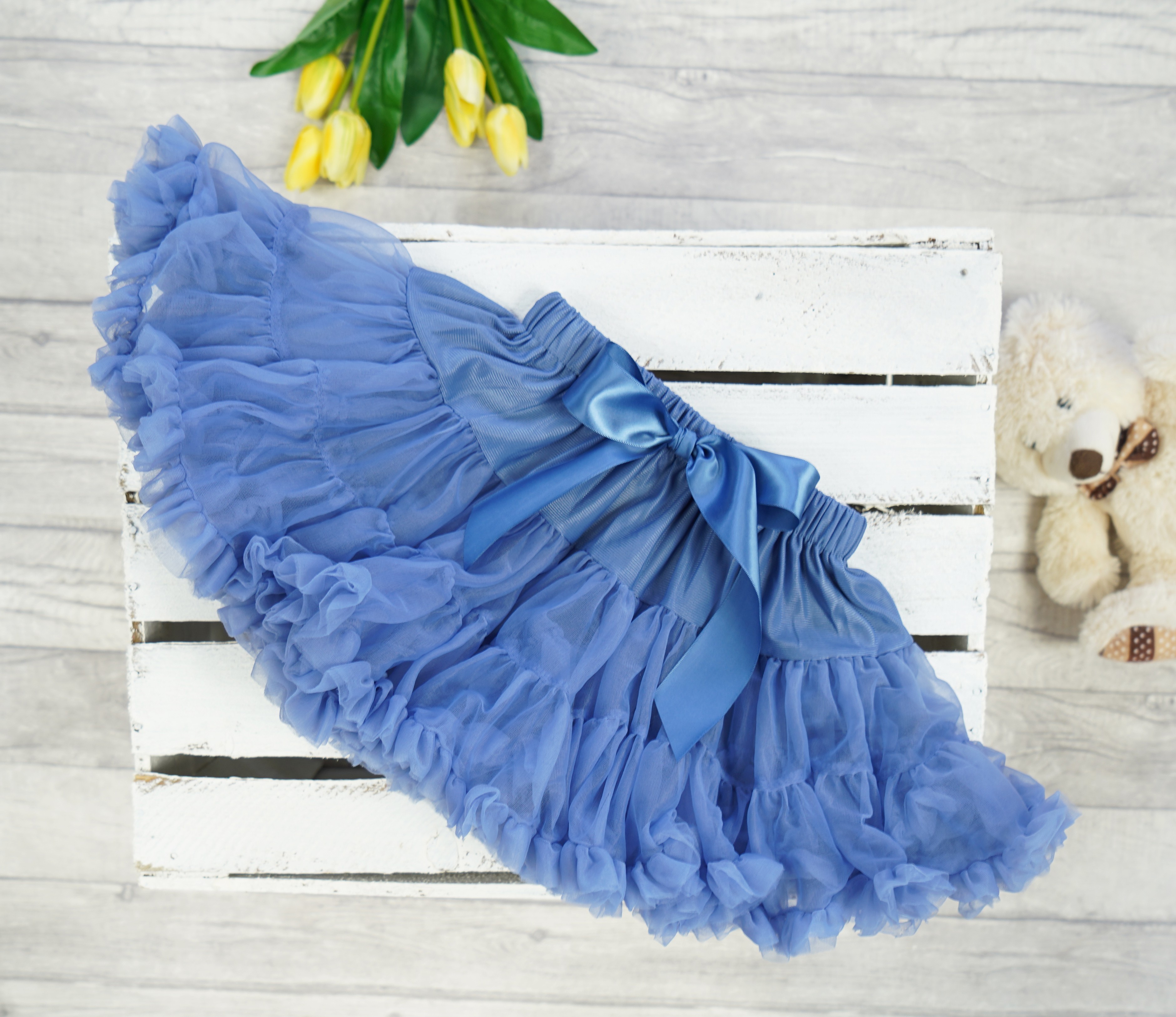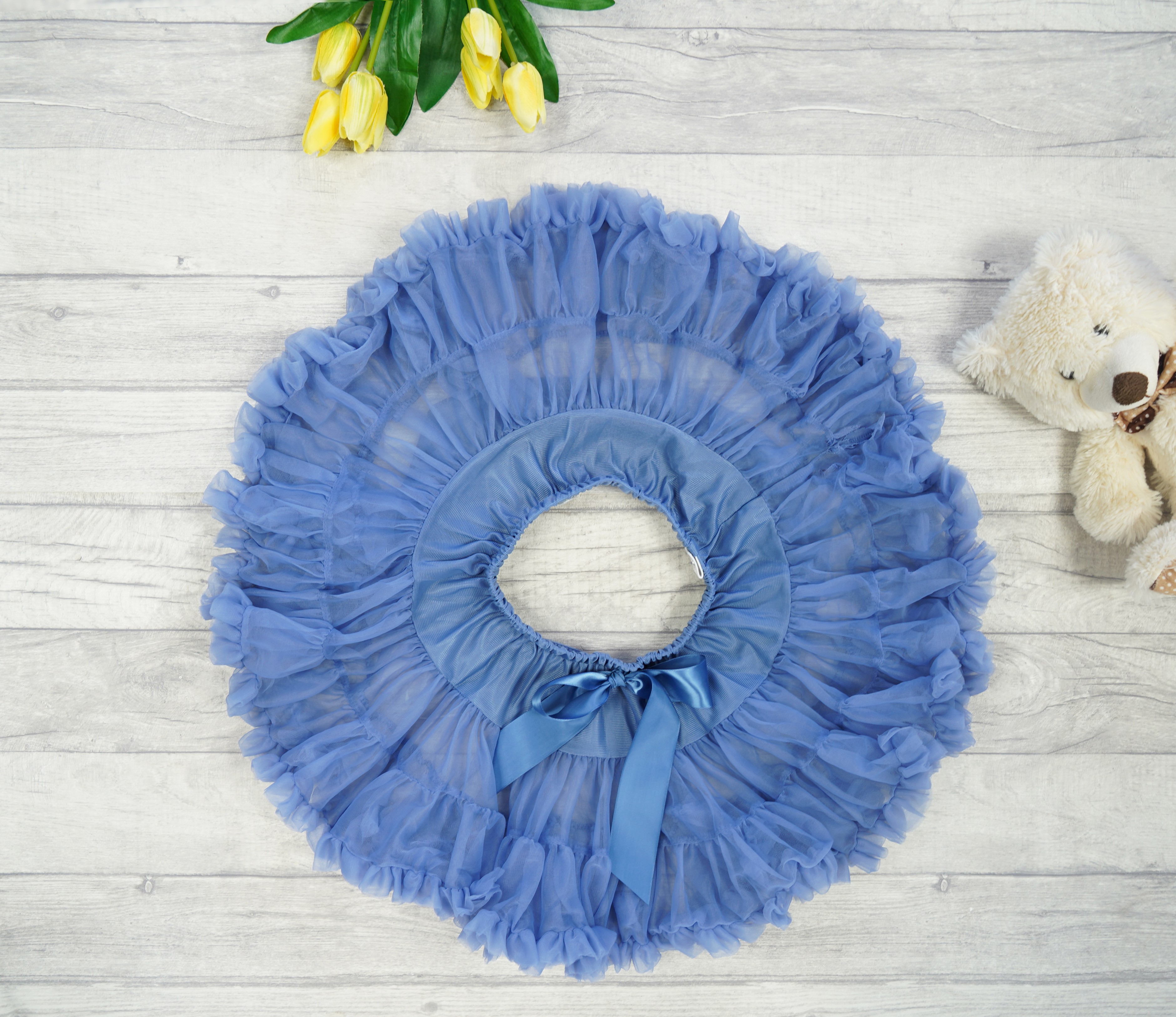 Tiulowa spódniczka dziewczęca z falbankami w kolorze niebieskim.