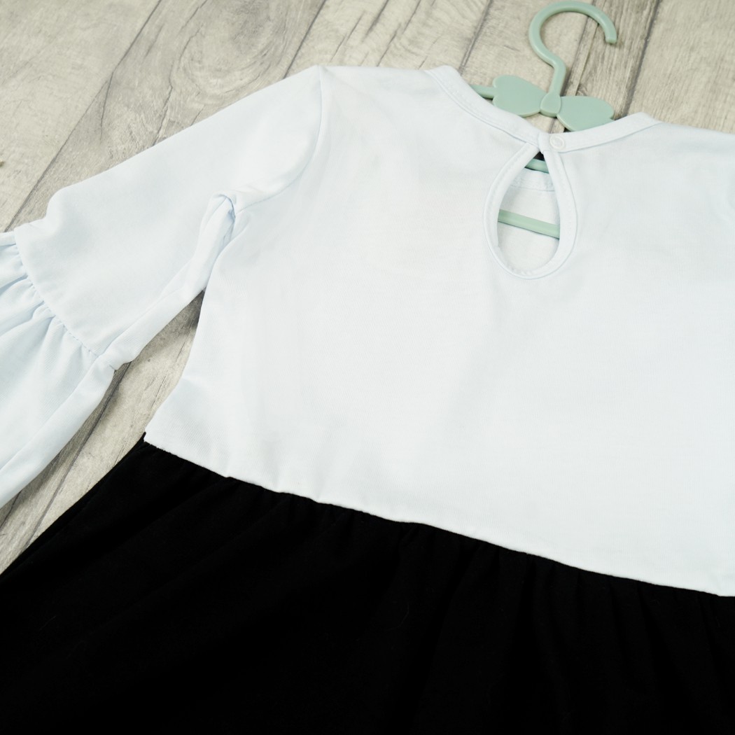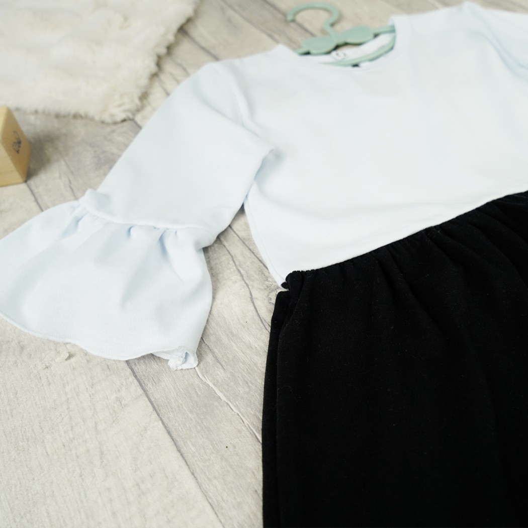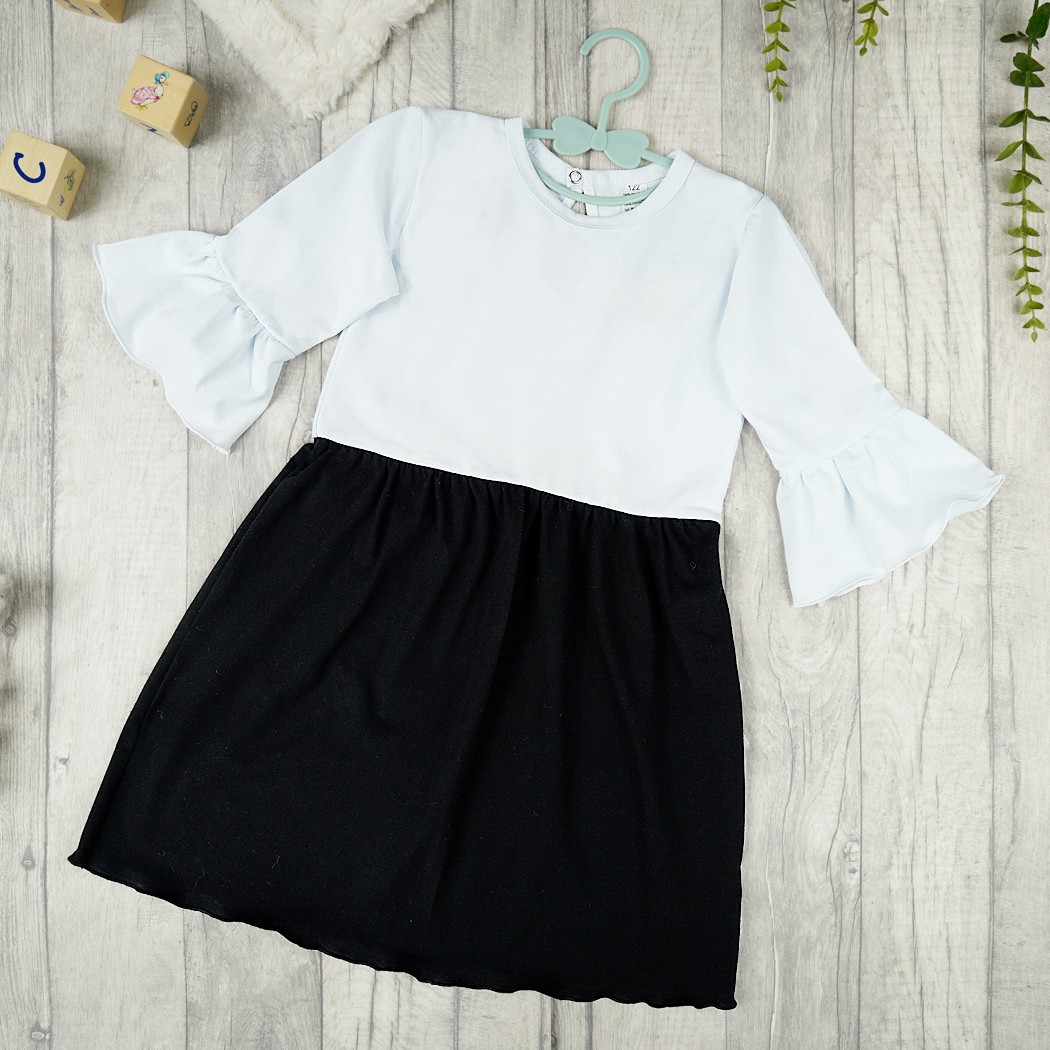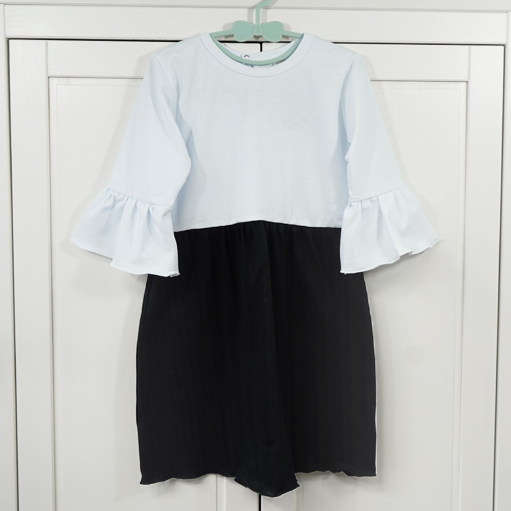 Sukienka ozdobiona falbankami na rękawach. Biało-czarna sukieneczka dla dziewczynki, biała na górze, czarna w dolnej części, przypominająca bluzkę oraz spódniczkę. Wciągana przez głowę i zapinana na karku na bezniklowy nap kończący ozdobną, wyciętą łezką. Przy szyjce wykończona delikatną lamówką. Uszyta z miękkiej i przyjemnej w dotyku bawełny.