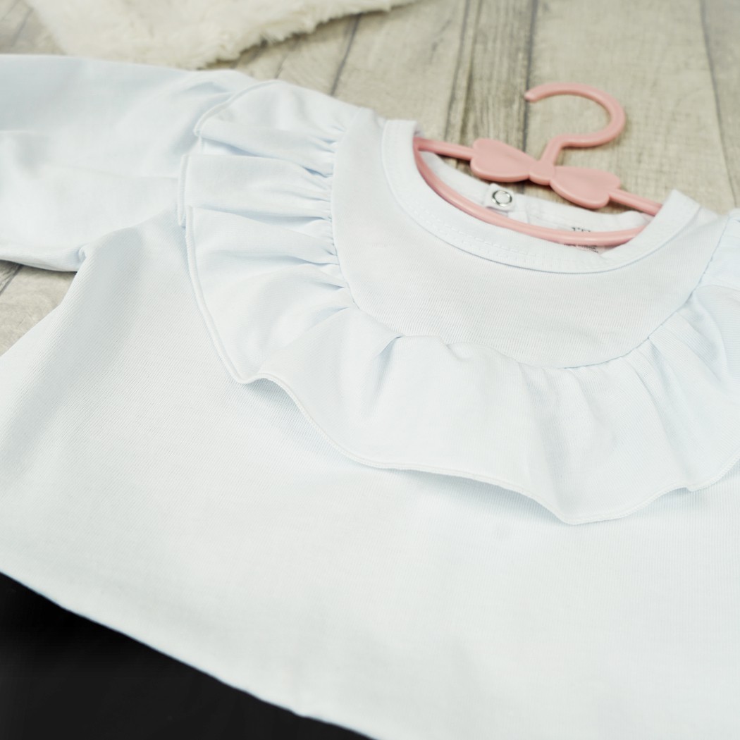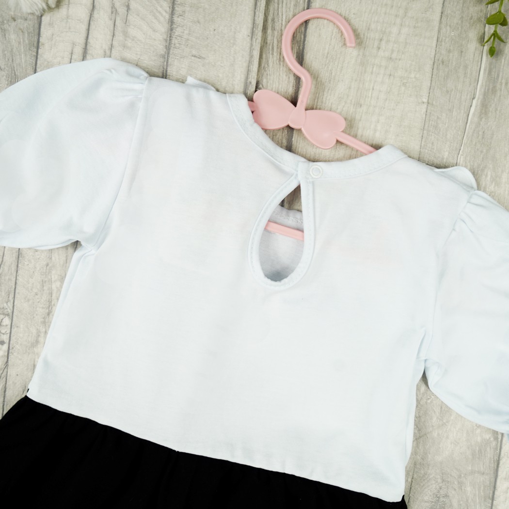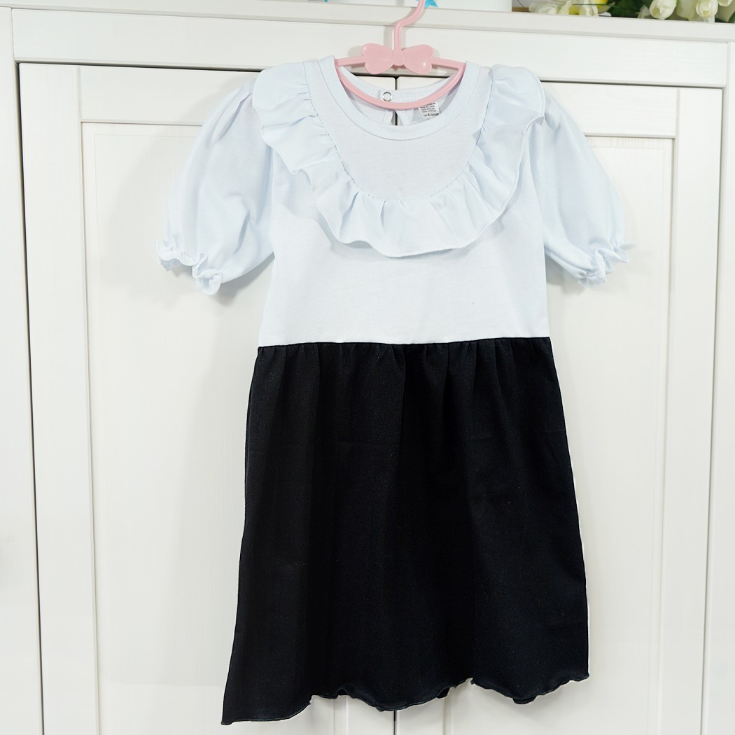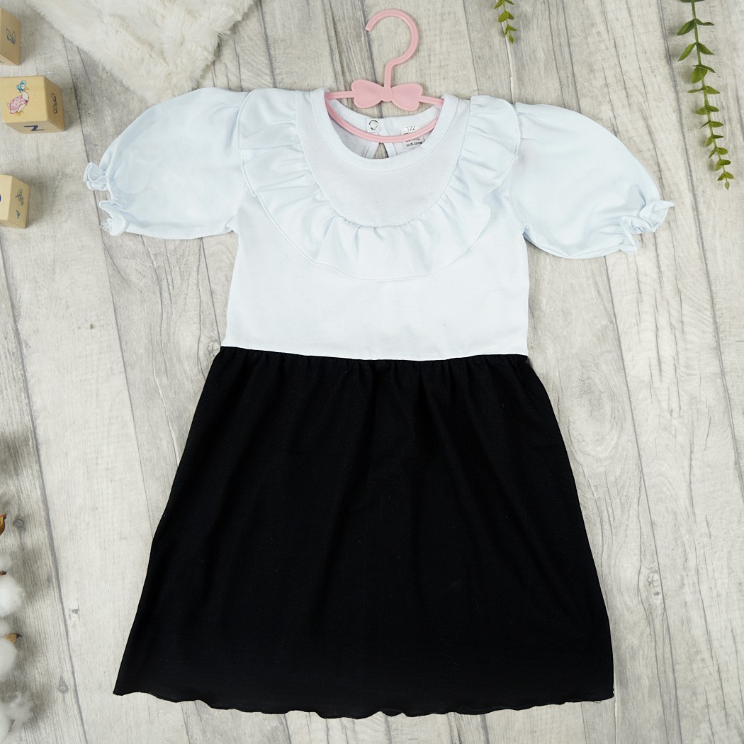 Sukienka ozdobiona uroczą falbanką na dekolcie. Sukieneczka dla dziewczynki w kolorze biało-czarnym z krótkim, bufiastym rękawem na delikatnej gumeczce. Biała góra i czarny dół sukienki przypomina elegancki zestaw bluzki i spódniczki. Wciągana przez głowę i zapinana na karku na bezniklowy nap kończący ozdobną, wyciętą łezkę. Przy szyjce wykończona delikatną lamówką. Uszyta z miękkiej i przyjemnej w dotyku bawełny.