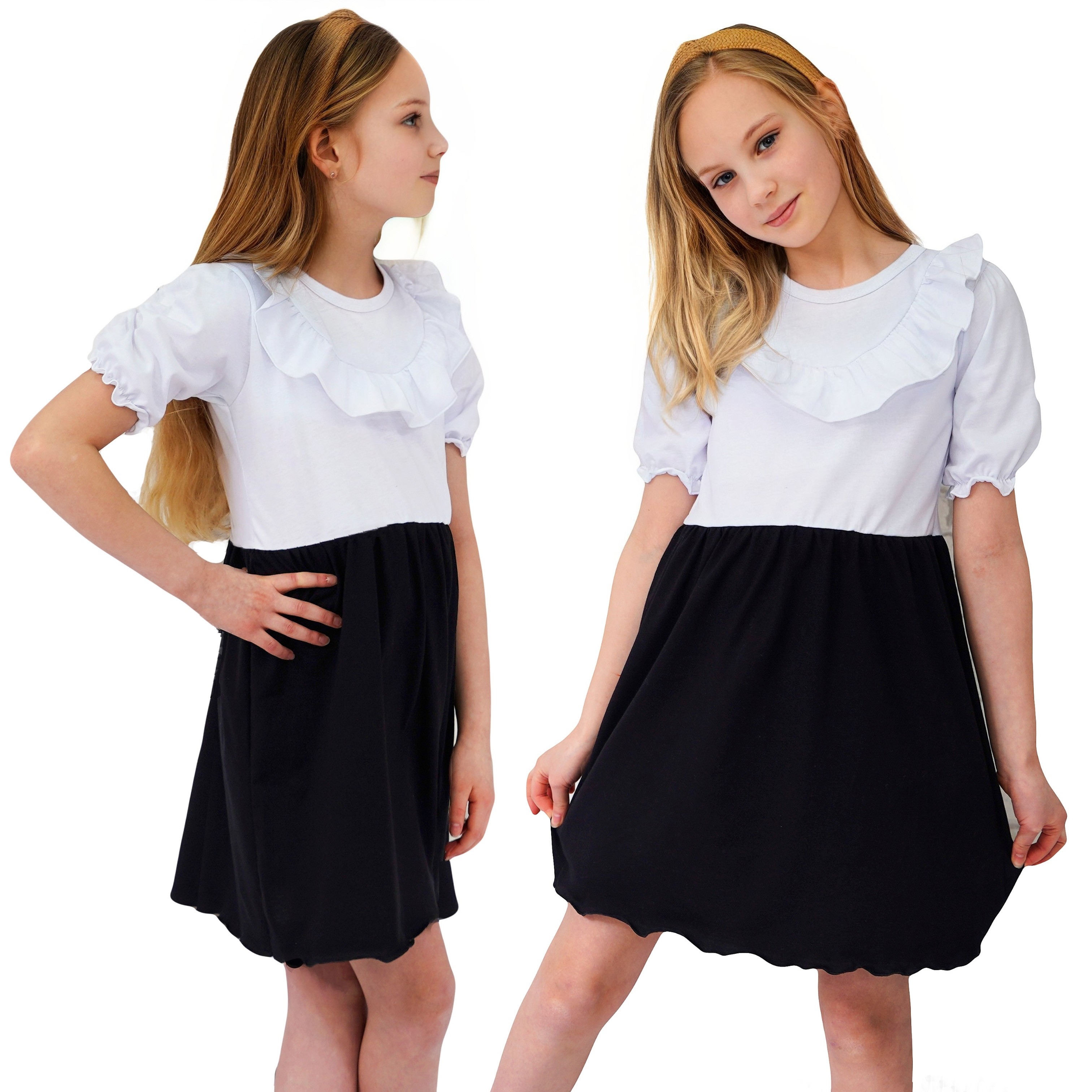 Sukienka dziewczęca z krótkim rękawem i falbanką kolor biało- czarny.