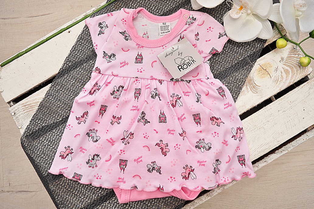 Różowa sukienka ozdobiona nadrukiem w kucyki i zamki. Sukieneczka dla dziewczynki z wszytym body w kolorze różowym. Wciągana przez głowę i zapinana na ramionach oraz w kroku na bezniklowe napki. Przy szyjce wykończona delikatną różową lamówką. Uszyta z miękkiej i przyjemnej w dotyku bawełny.
