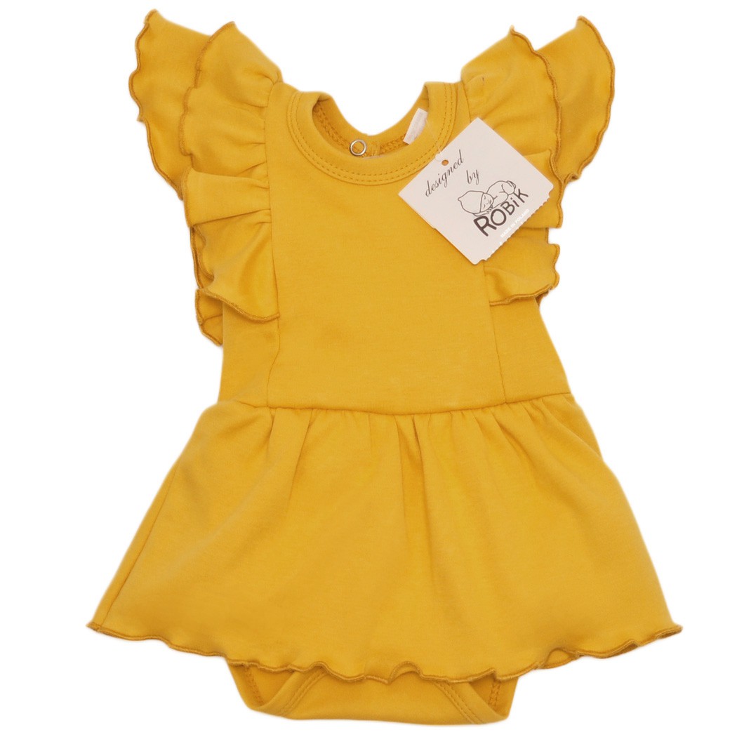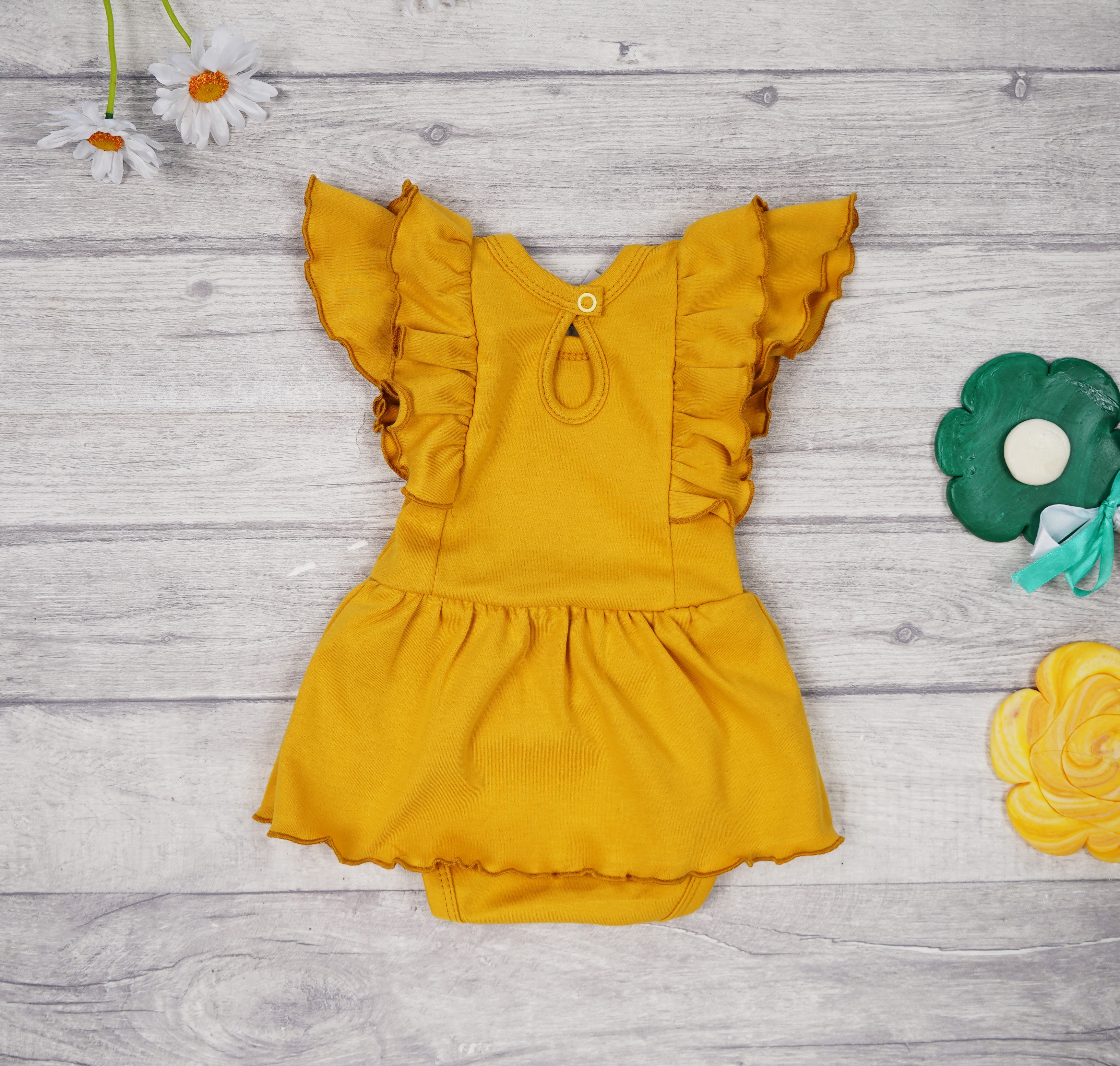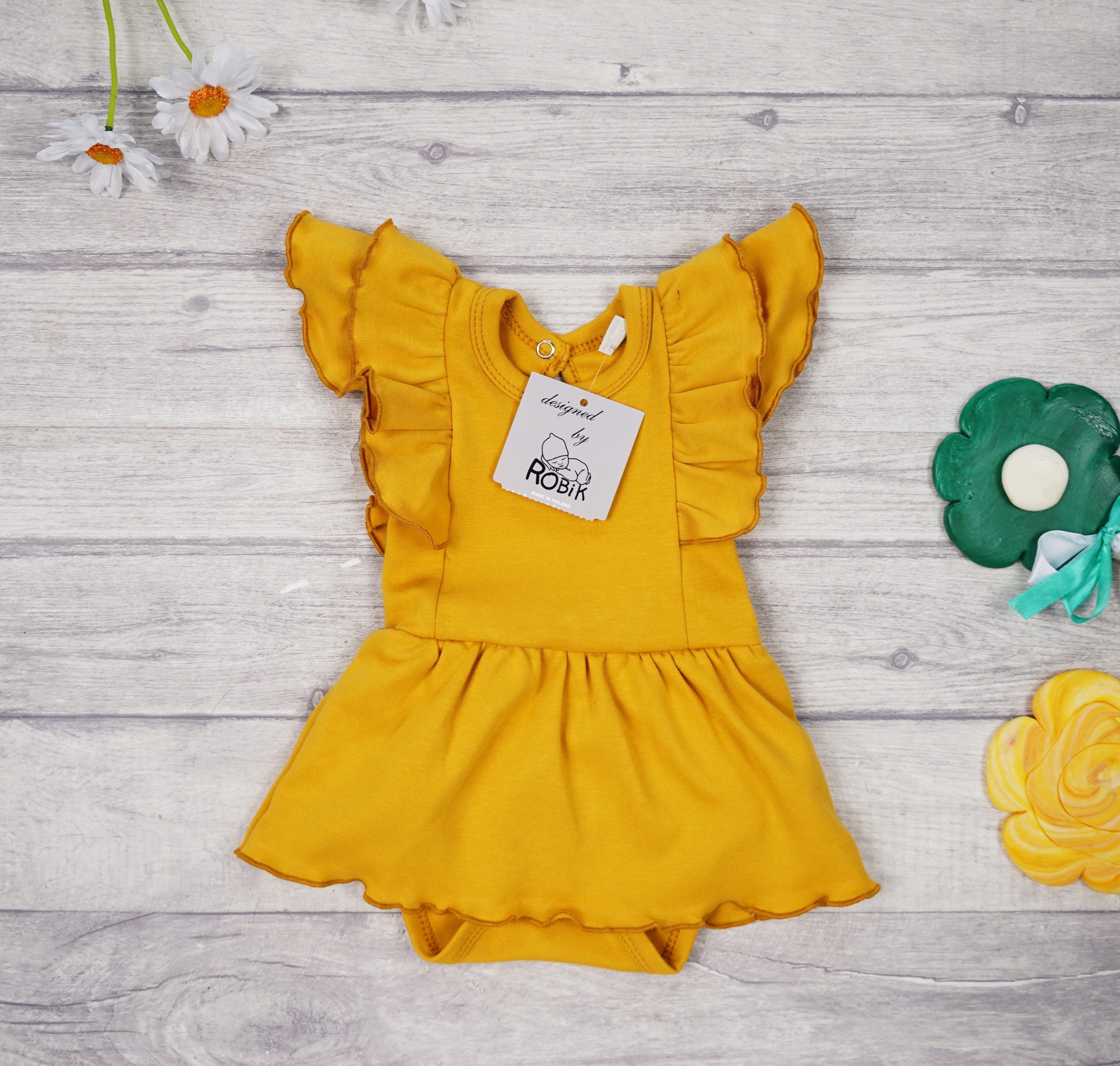 Sukienka niemowlęca połączona z body, krótki, falbaniasty rękaw, kolor musztardowy.