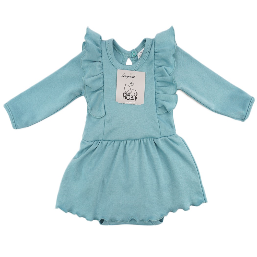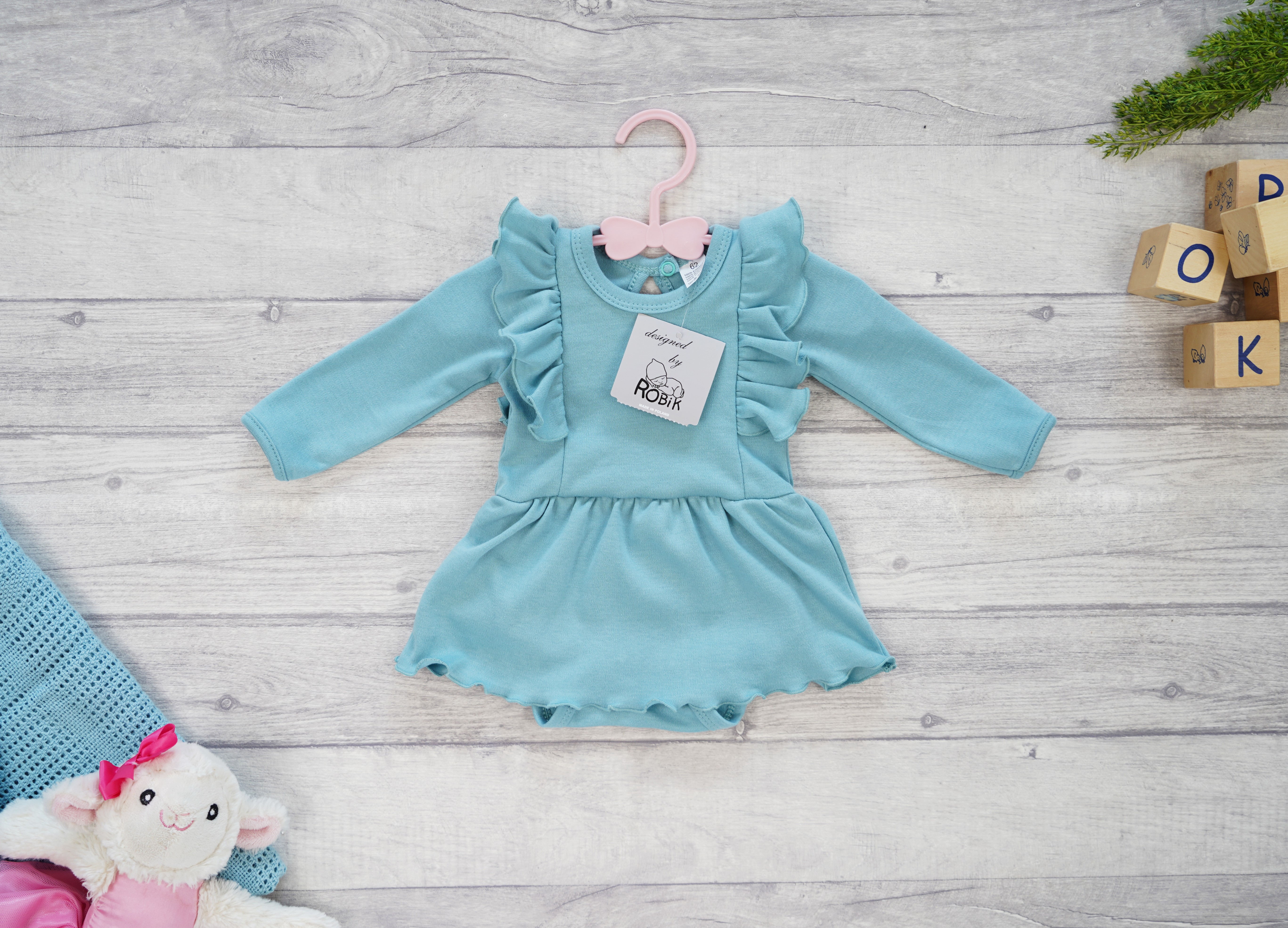 Sukienka niemowlęca połączona z body, długi, falbaniasty rękaw, kolor iceberg.