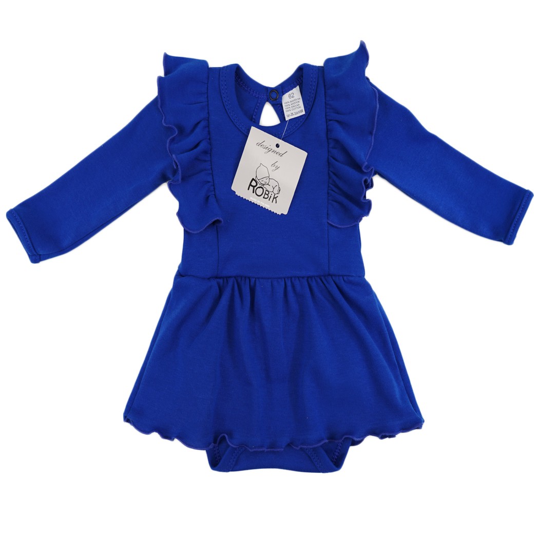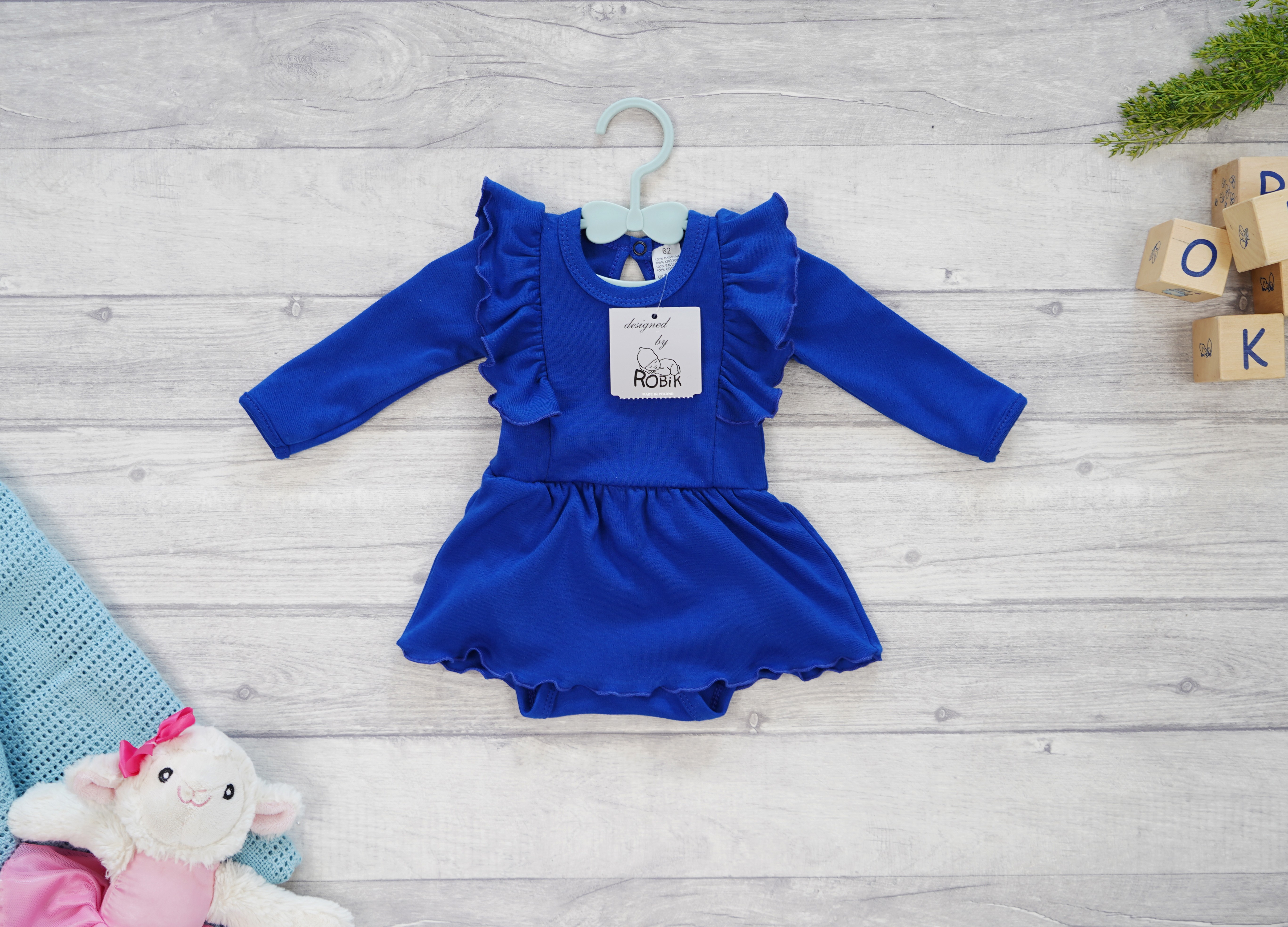 Sukienka niemowlęca połączona z body, długi, falbaniasty rękaw, kolor chabrowy.