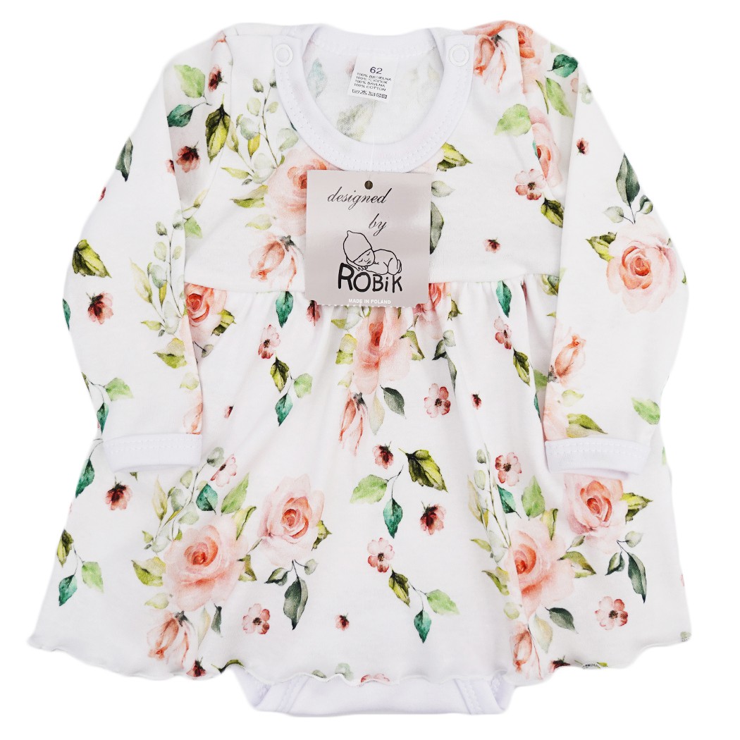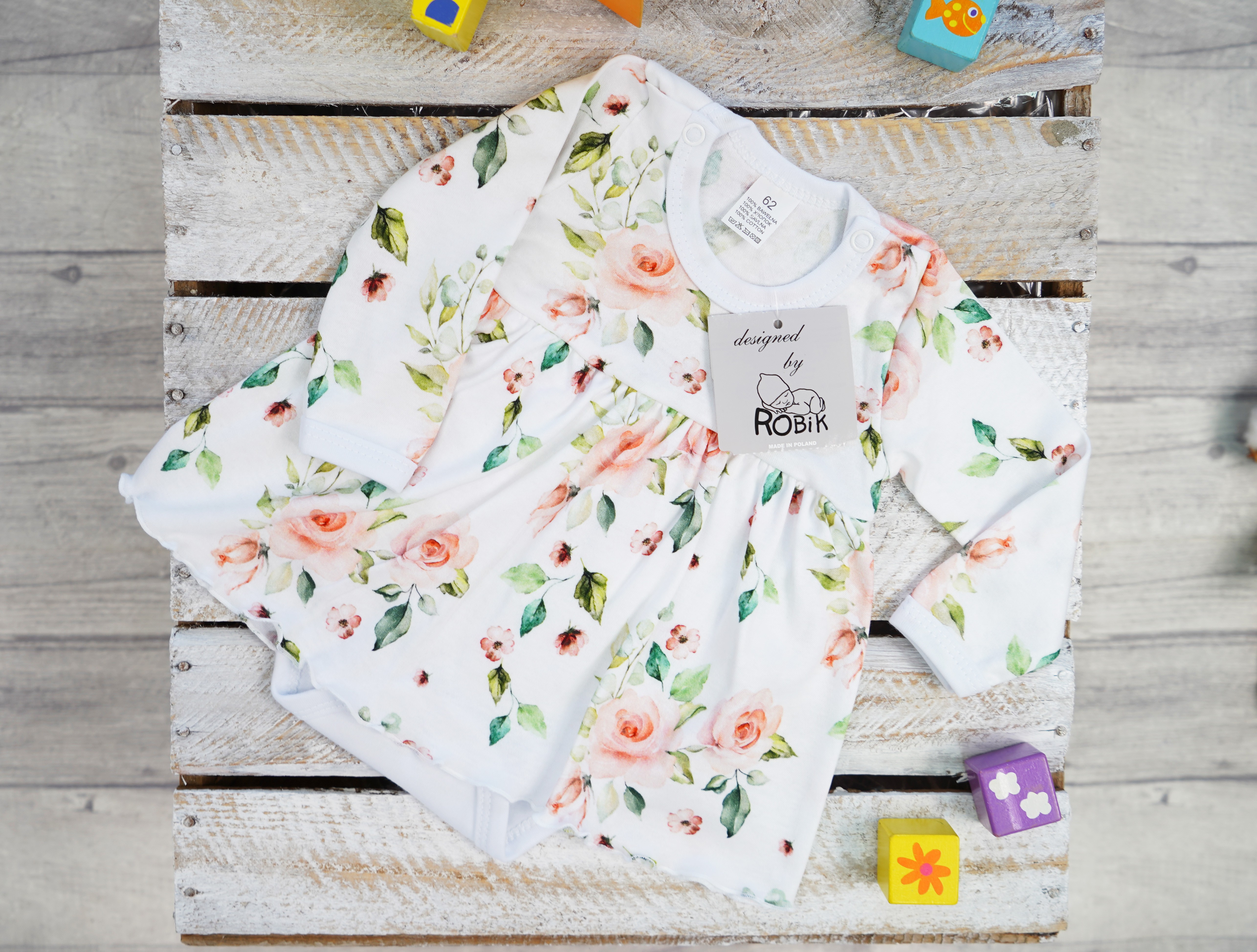 Biała sukienka niemowlęca połączona z body, długi rękaw we róże i zielone liście.