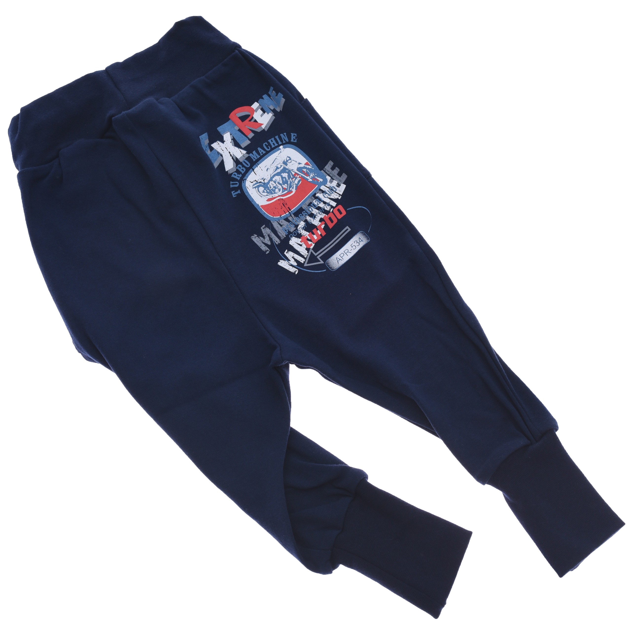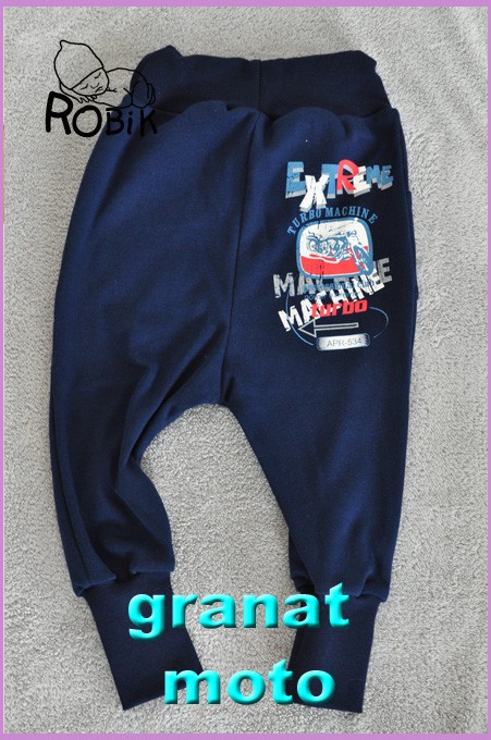 Chłopięce spodnie dresowe, wiosenno-jesienne, uniwersalne na każdą pogodę. Model ten doskonale się sprawdza w przypadku zmiennej pogody - zwłaszcza na długich spacerach. W jednej chwili ze spodni 3/4 można zrobić spodnie długie, a tym samym cieplejsze. Na górze spodnie są luźniejsze i mają obniżony krok, następnie zwężają się ku dołowi. W pasie posiadają wygodny ściągacz oraz dwie kieszenie z przodu. Tego rodzaju spodnie dla chłopca to idealne połączenie mody i wygody!