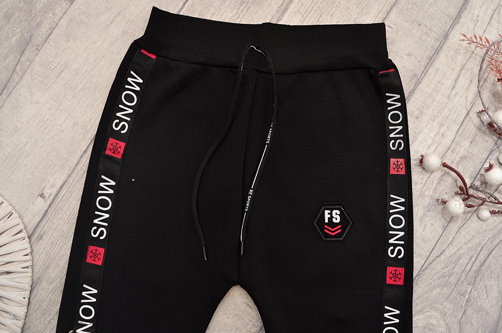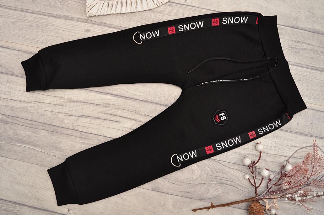 Czarne spodnie chłopięce na zimę wykonane z ciepłej, mięsistej tkaniny pokrytej od wewnątrz meszkiem. W pasie znajduje się szeroka guma oraz ozdobny sznurek. Szczególnego uroku dodają tym ocieplanym spodniom umiejscowione po boku pasy z napisem SNOW oraz ozdobny emblemat umiejscowiony u góry na nogawce. Nogawki spodni wykończone ściągaczem