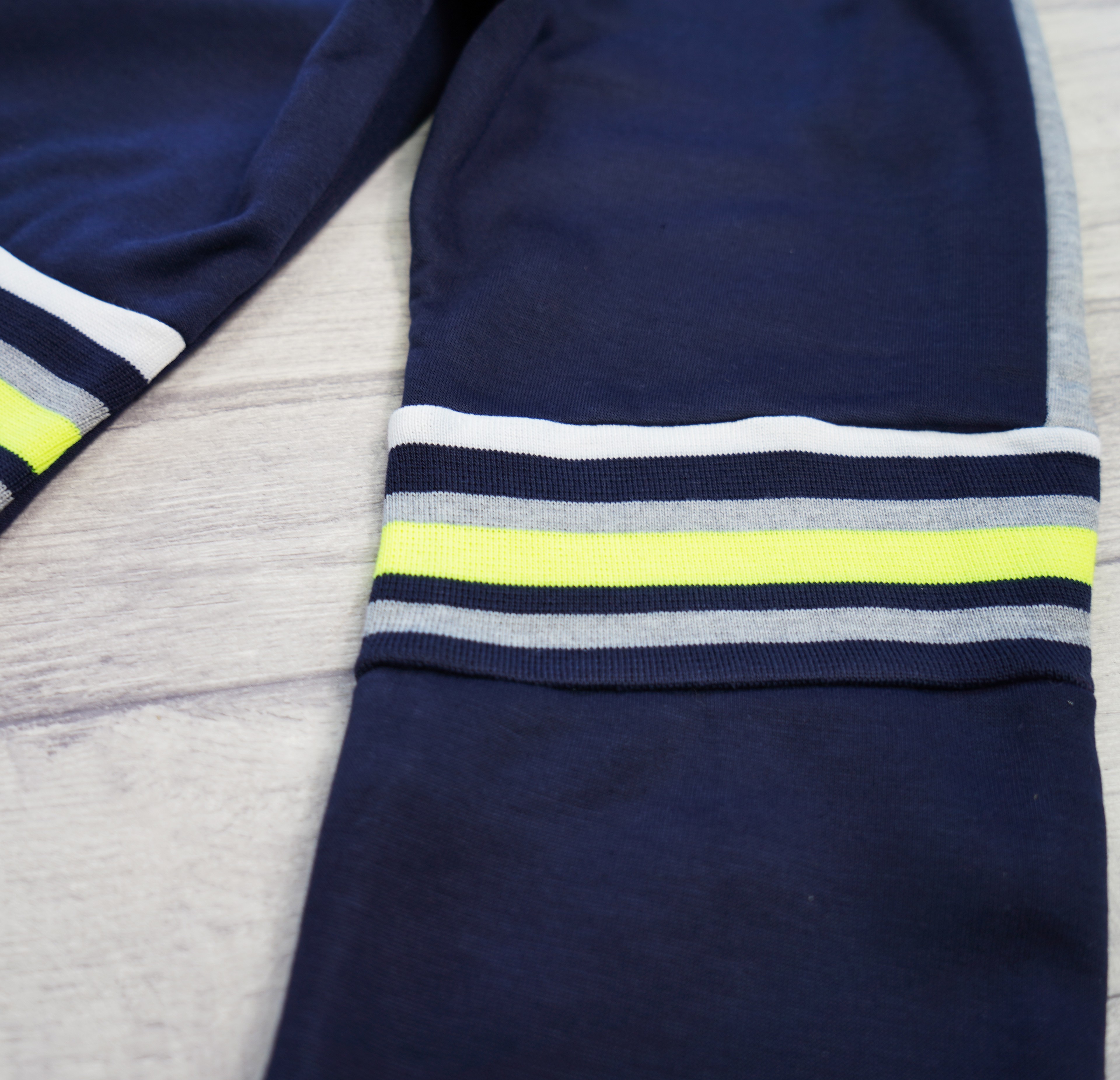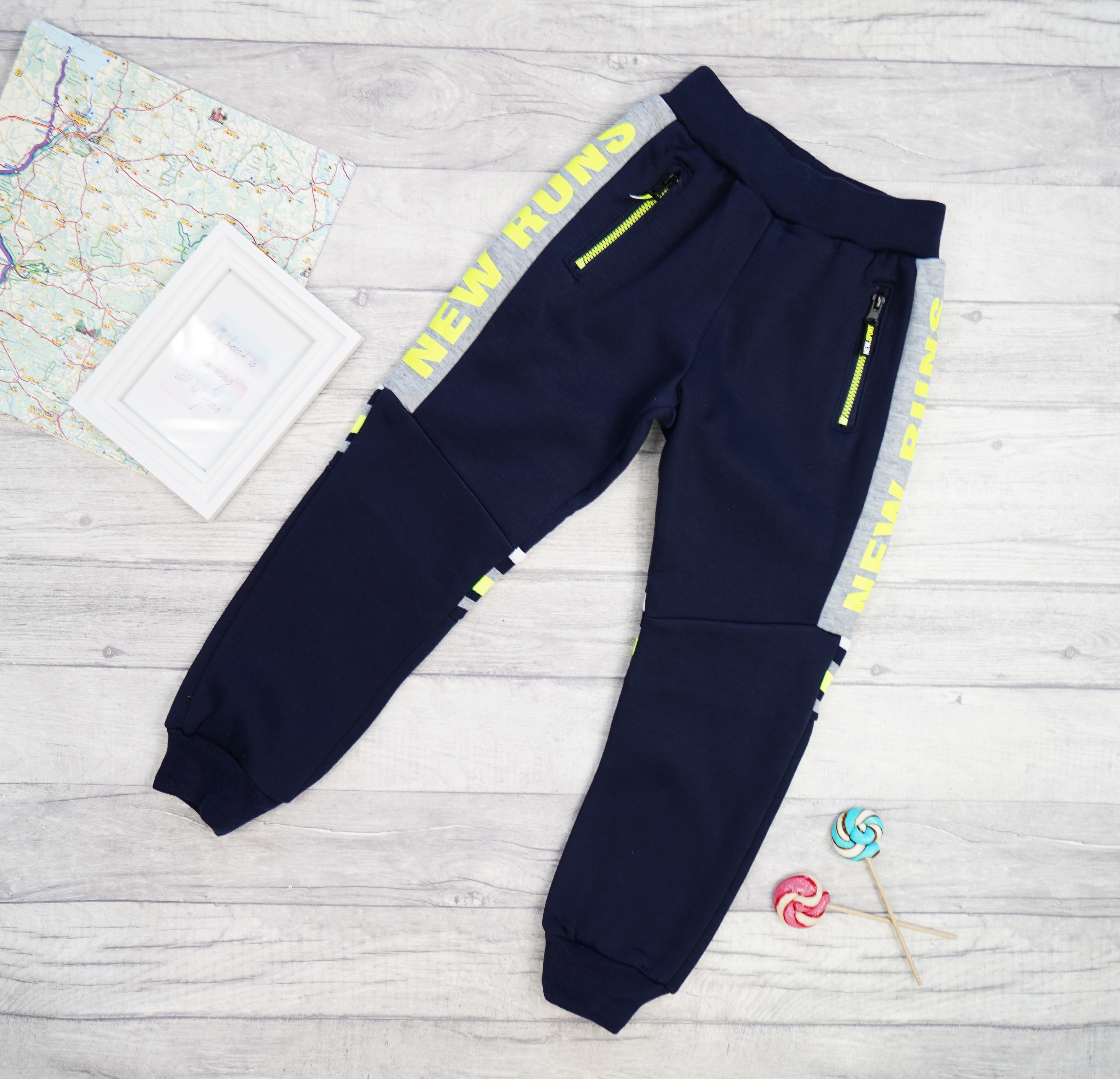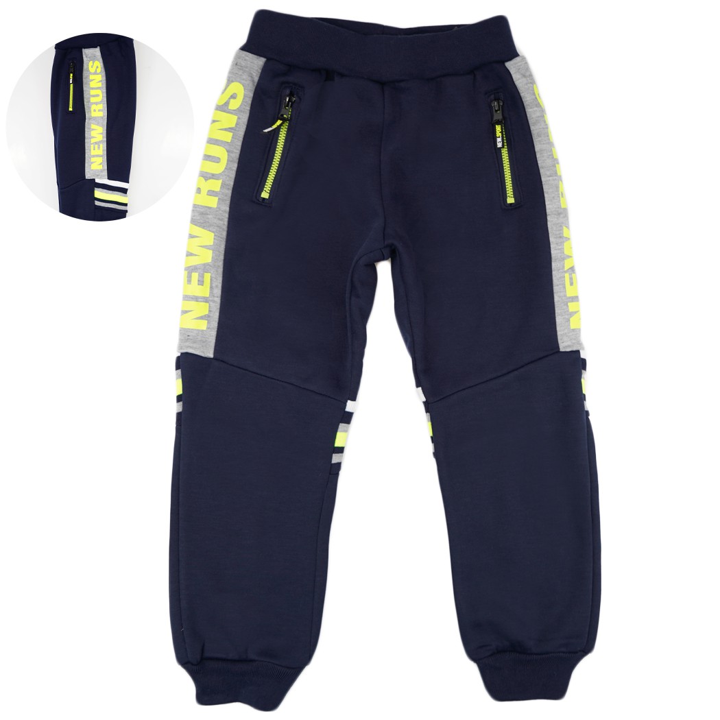 Spodnie chłopięce na zimę wykonane z tkaniny pokrytej od wewnątrz grubym meszkiem. W pasie znajduje się szeroka guma. Spodnie posiadają dwie wewnętrzne kieszenie zamykane na żółty suwak. Nogawki spodni wykończone zostały nieuciskającym ściągaczem. Spodnie ocieplane zdobią szare lampasy z napisami "NEW RUNS", tył spodni pod kolanami zaopatrzony jest w wygodne ściągacze w paski.