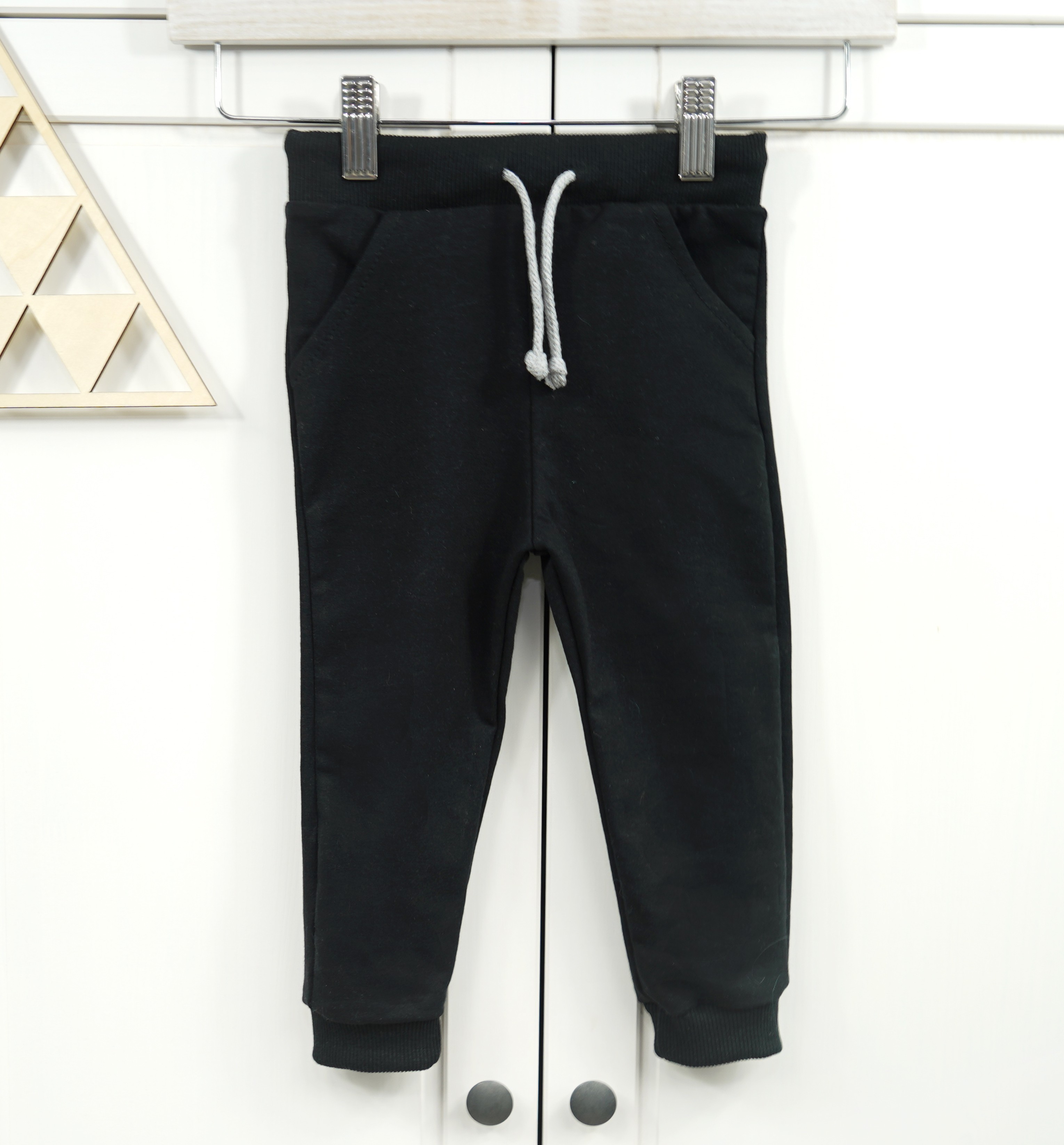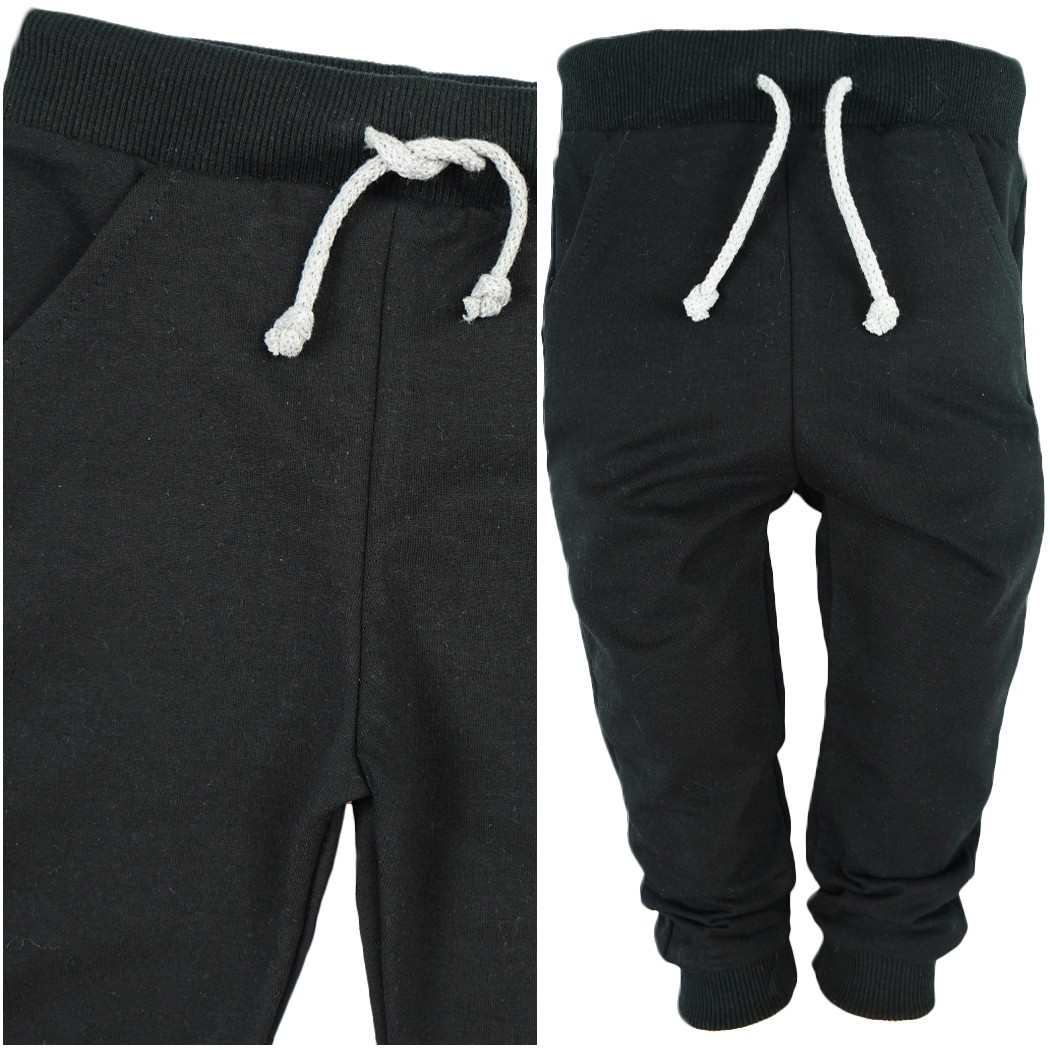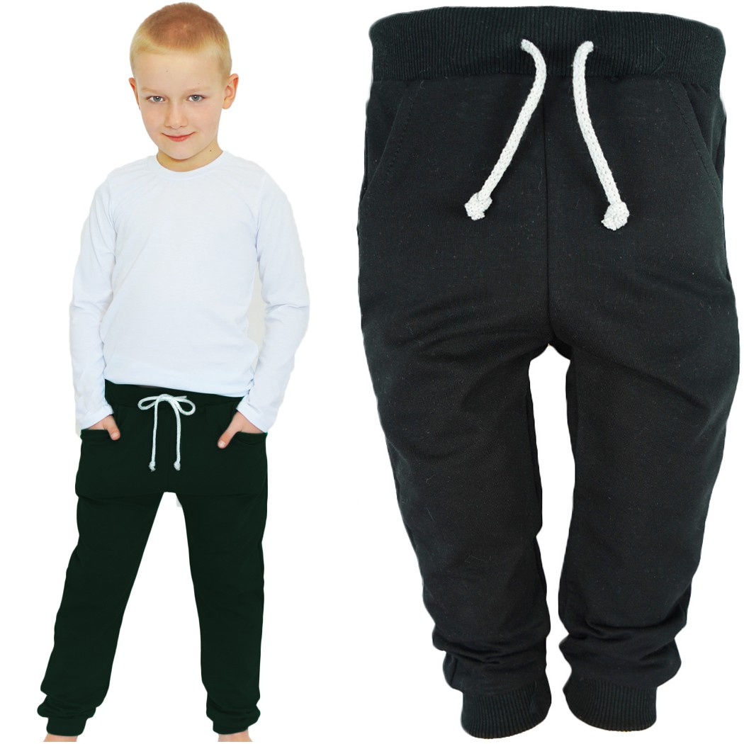 Jednokolorowe dresowe spodnie dziecięce, gładkie, bez wzorów z szerokim pasem, wewnątrz paska elastyczna guma oraz jasny sznurek umożliwiający regulowanie szerokości. Posiadają dwie wewnętrzne kieszenie a nogawki zostały wykończone ściągaczem.