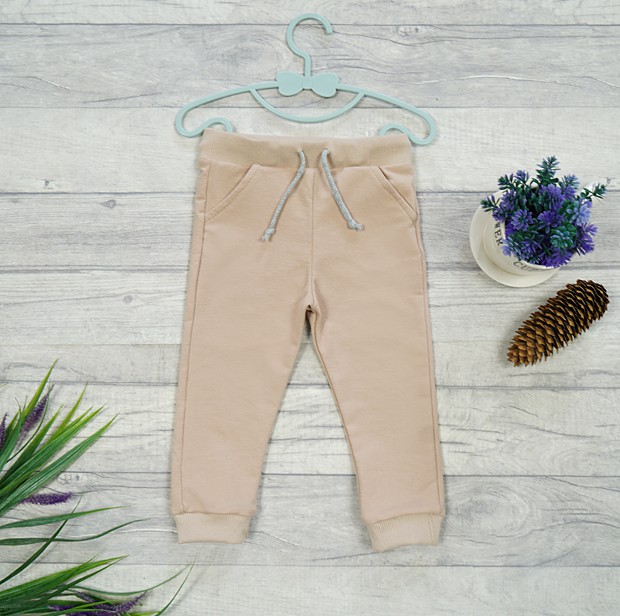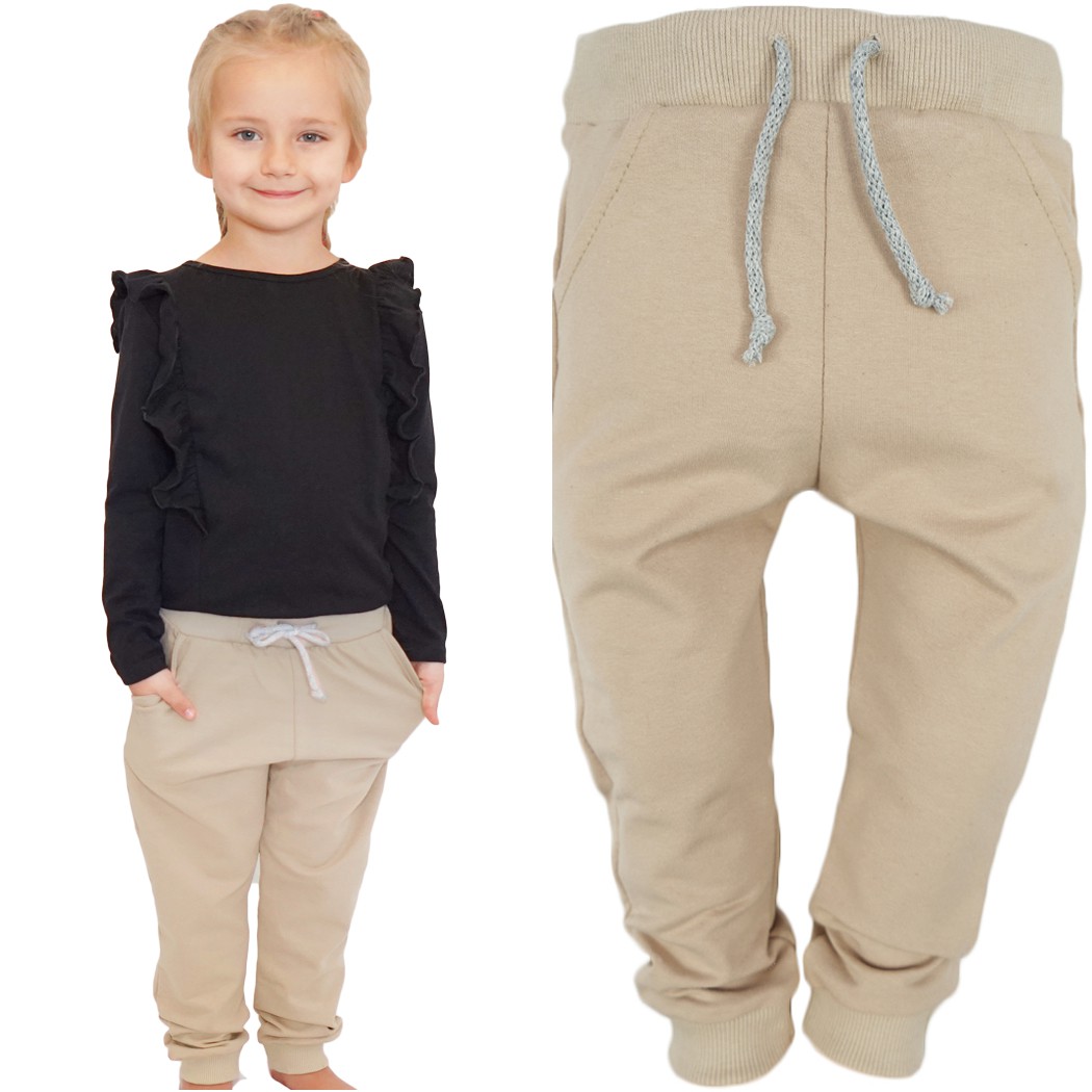 Jednokolorowe dresowe spodnie dziecięce, gładkie, bez wzorów z szerokim pasem, wewnątrz paska elastyczna guma oraz jasny sznurek umożliwiający regulowanie szerokości. Posiadają dwie wewnętrzne kieszenie a nogawki zostały wykończone ściągaczem.
