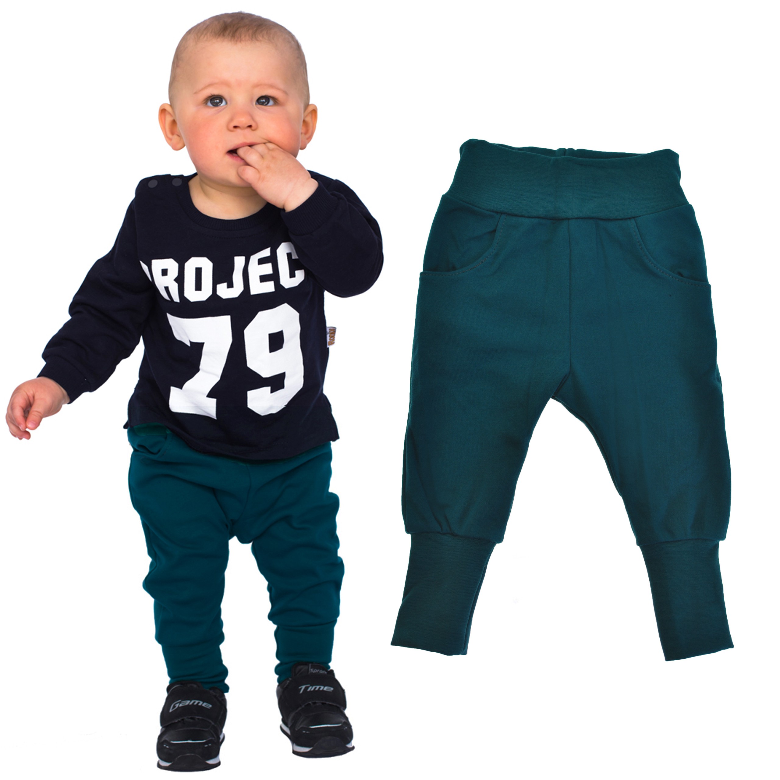 Wywijane ściągacze przy nogawkach - umożliwiają regulację długości spodni, funkcja przydatna w miarę wzrostu malucha ułatwia też wkładanie stopy podczas ubierania