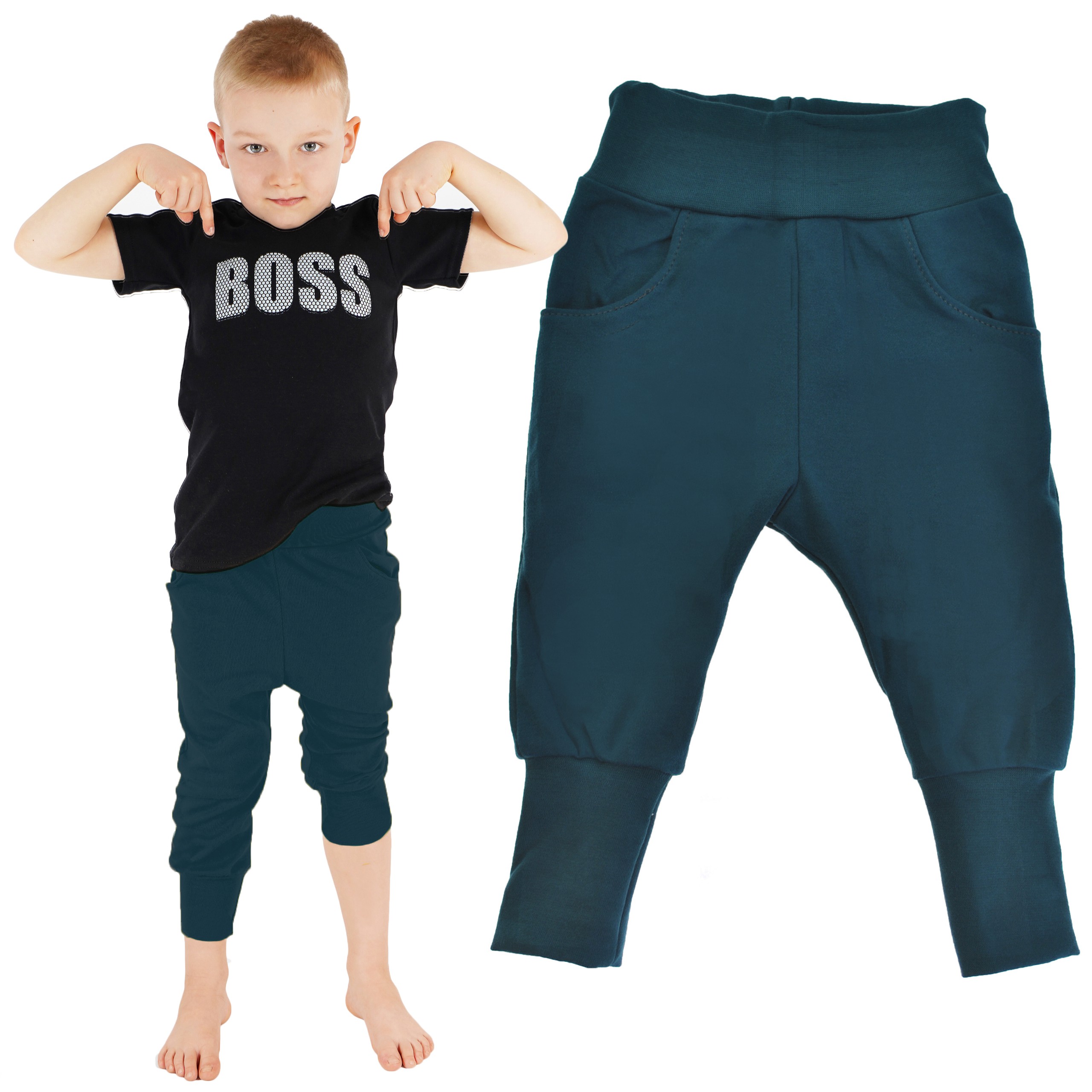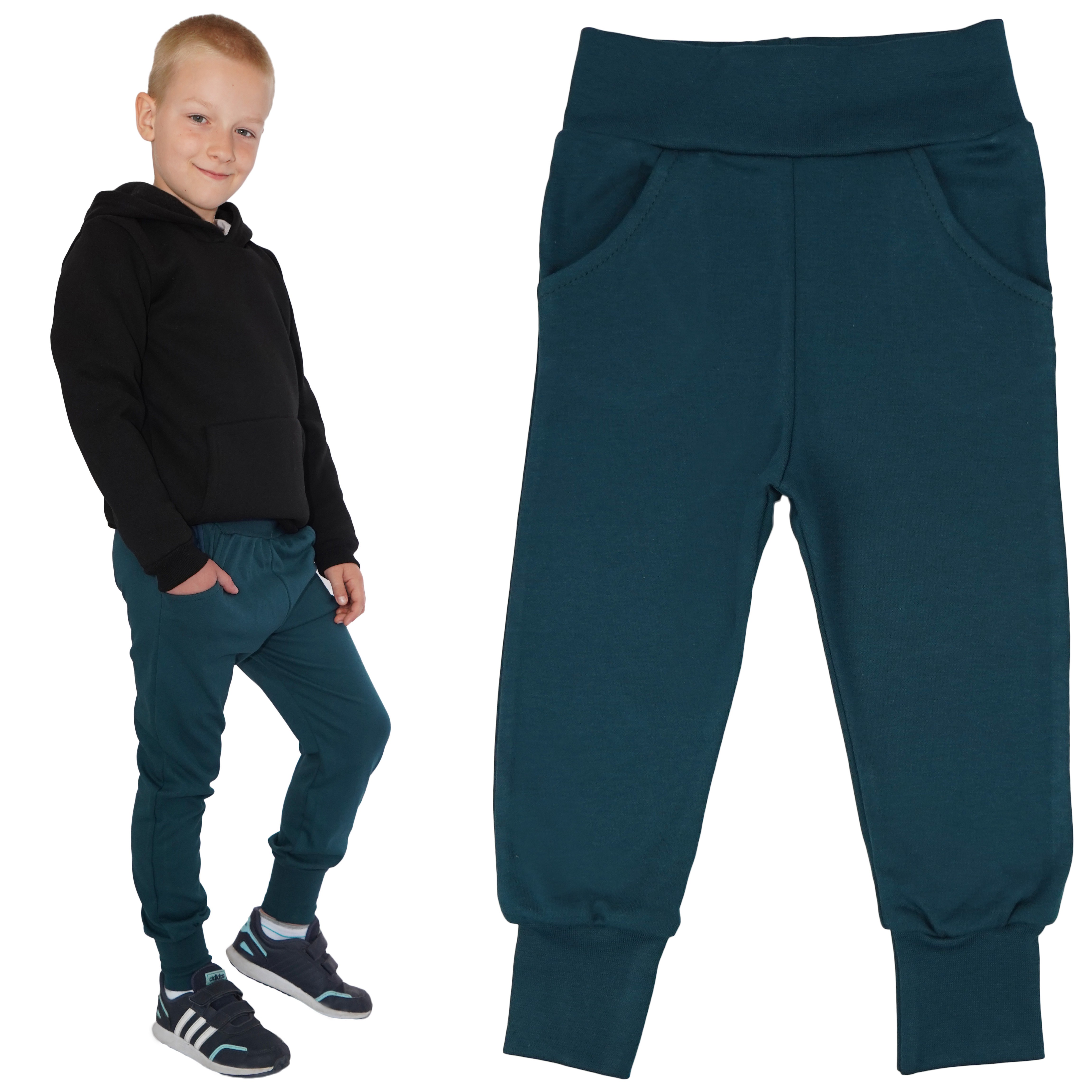 Nasza kolekcja bawełnianych spodni z wyciąganą gumką w pasie, kieszeniami i wywijanymi ściągaczami przy nogawkach to doskonałe rozwiązanie dla rodziców poszukujących wygodnych i praktycznych ubrań dla swoich dzieci.