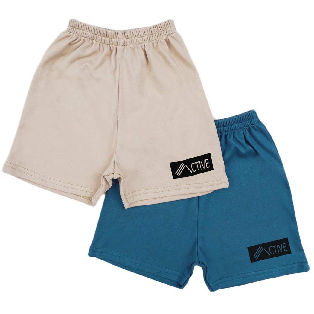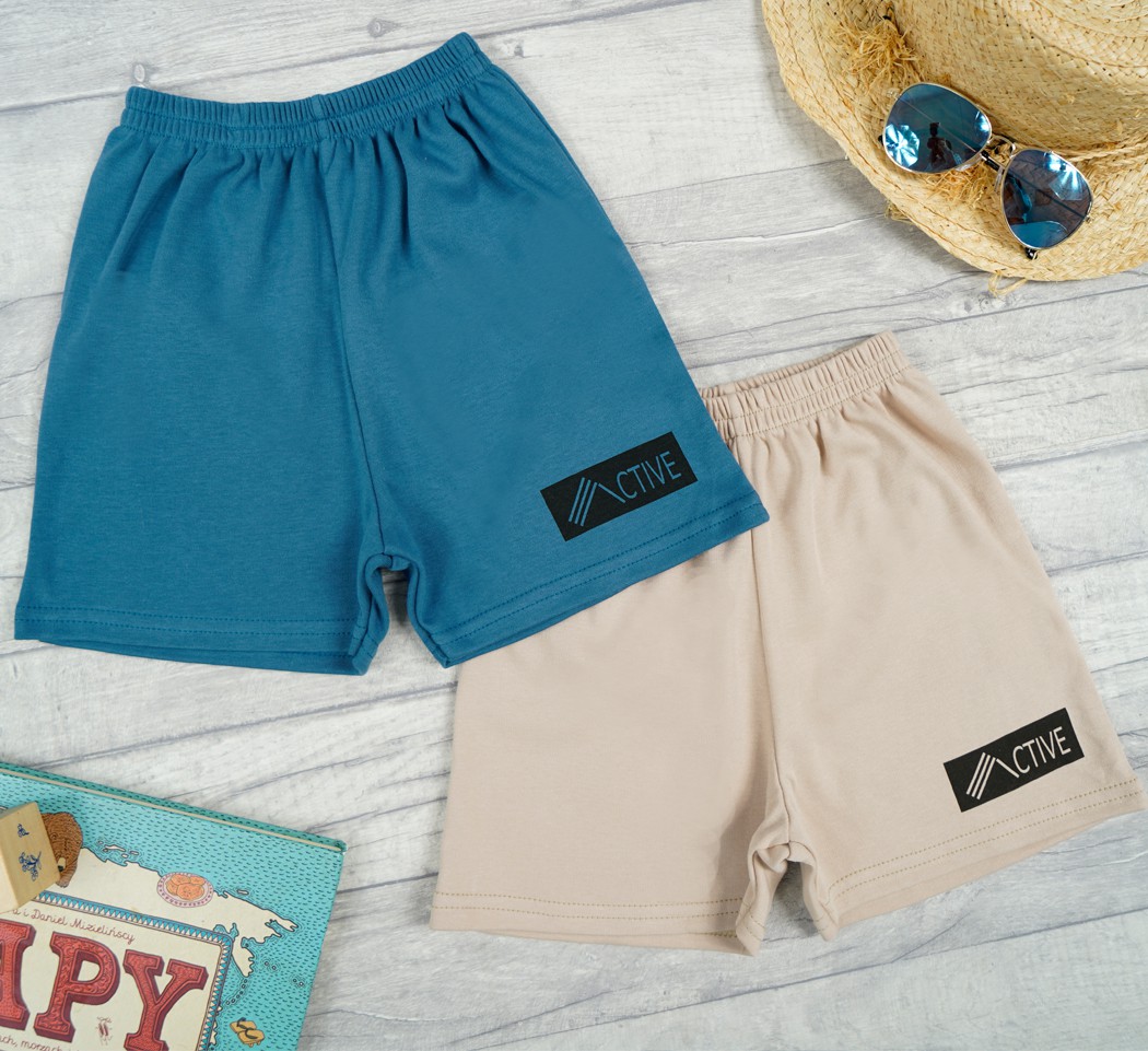 Bawełniane krótkie spodenki chłopięce w 2 kolorach z napisem active. Posiadają elastyczną gumkę w pasie. Sportowy krój tych chłopięcych szortów oraz lekki materiał zapewniają swobodę ruchów podczas różnych aktywności. Na lewej nogawce ozdobny nadruk "ACTIVE".