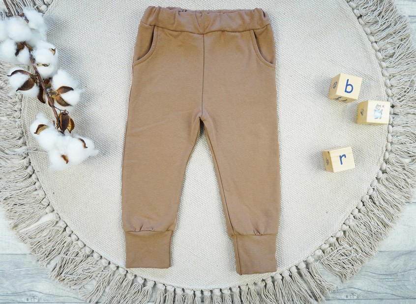 Spodnie z meszkiem dziewczęce i chłopięce w kolorze beżowo- camelowym.