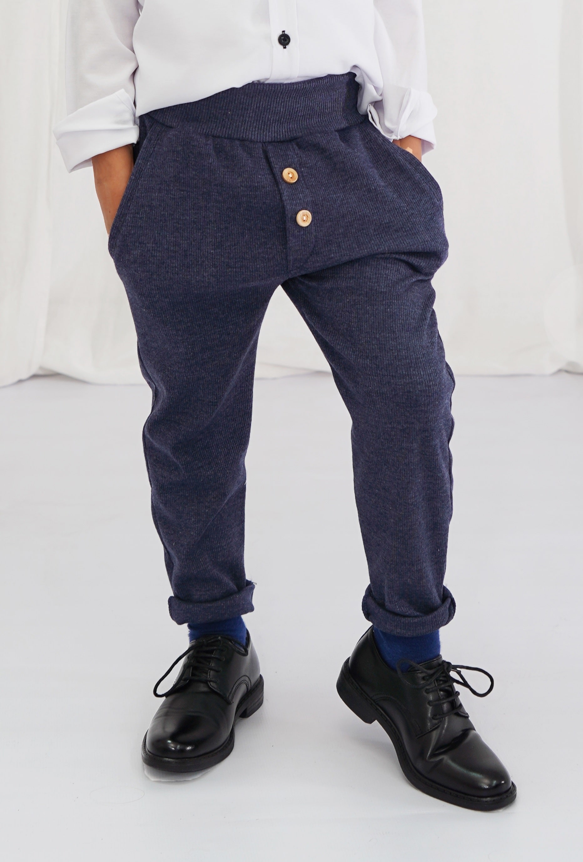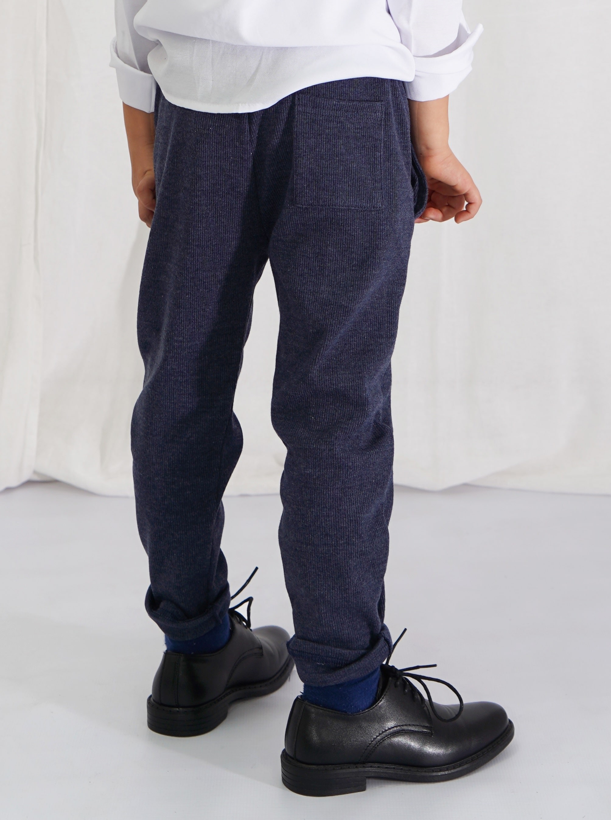 Te praktyczne granatowe spodnie wizytowe chłopięce o wygodnym kroju i prążkowym materiale idealnie dopasowują się do kształtu ciała dziecka i nadążają za jego potrzebą ruchu.