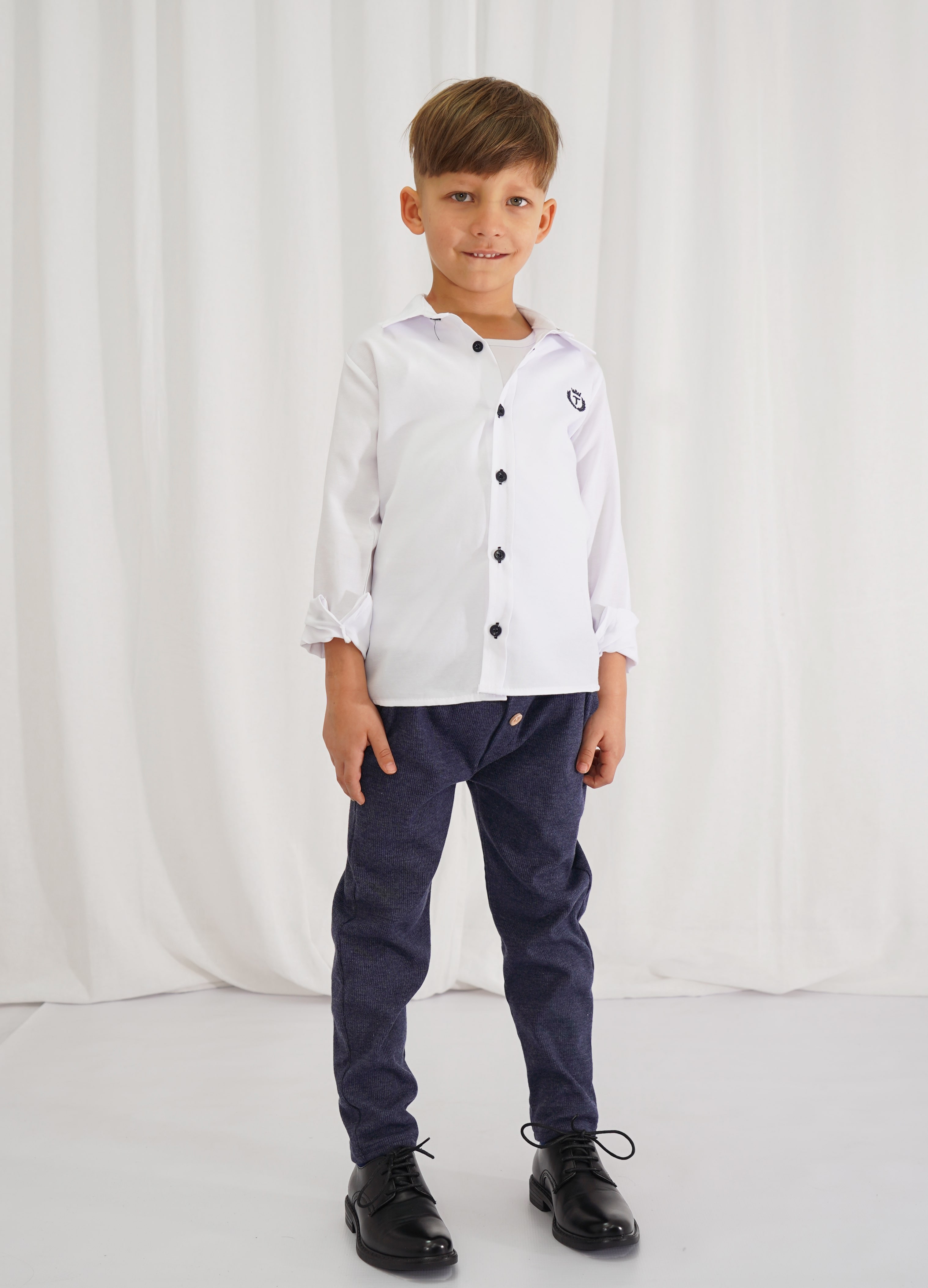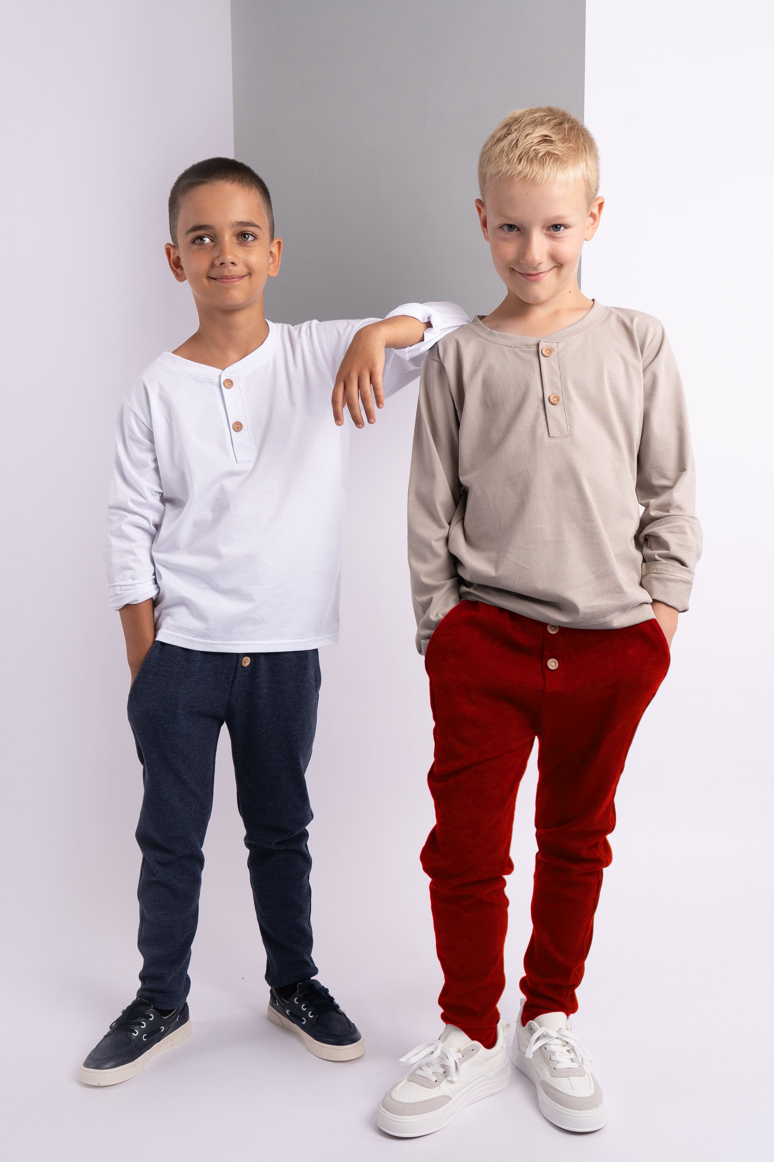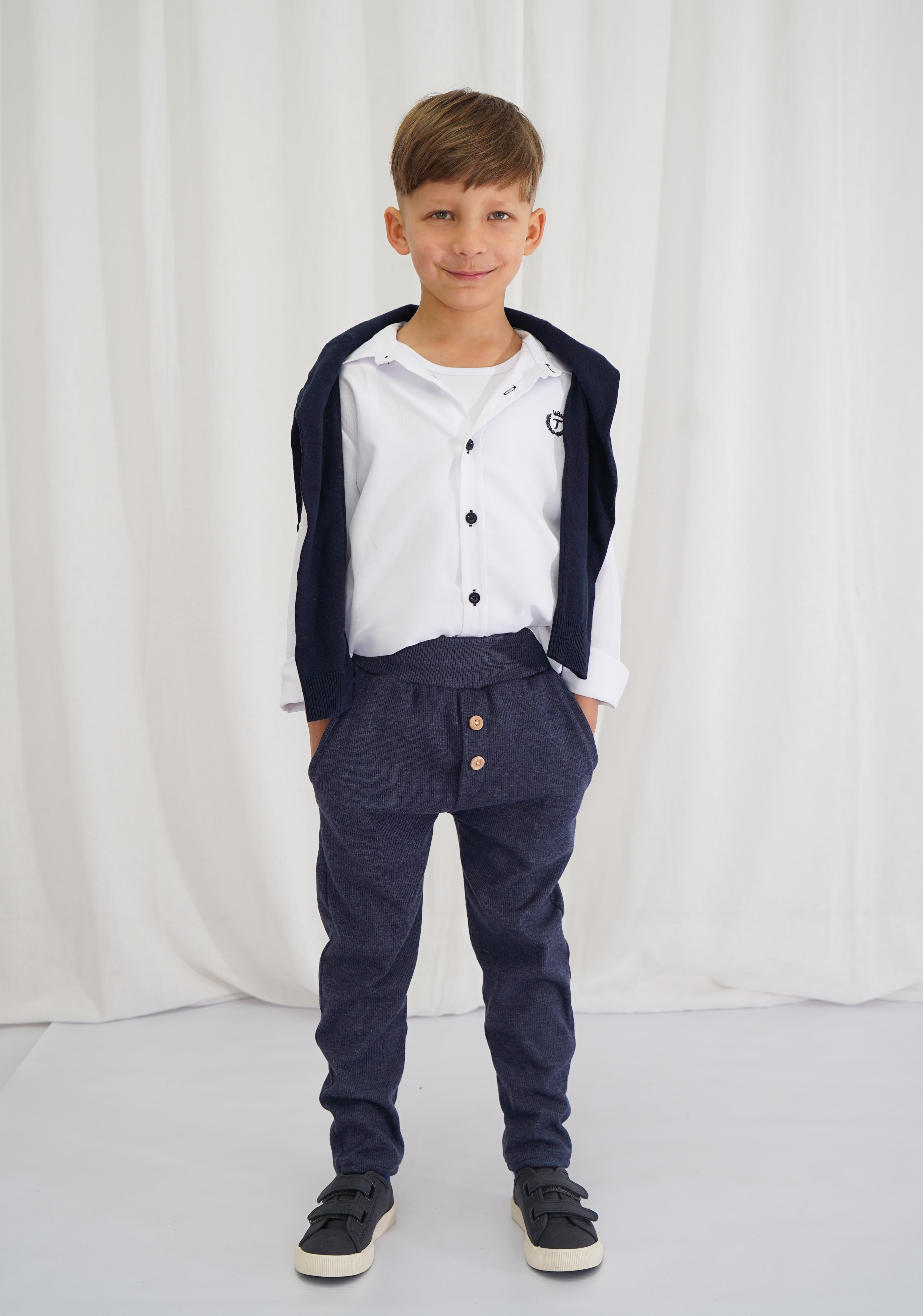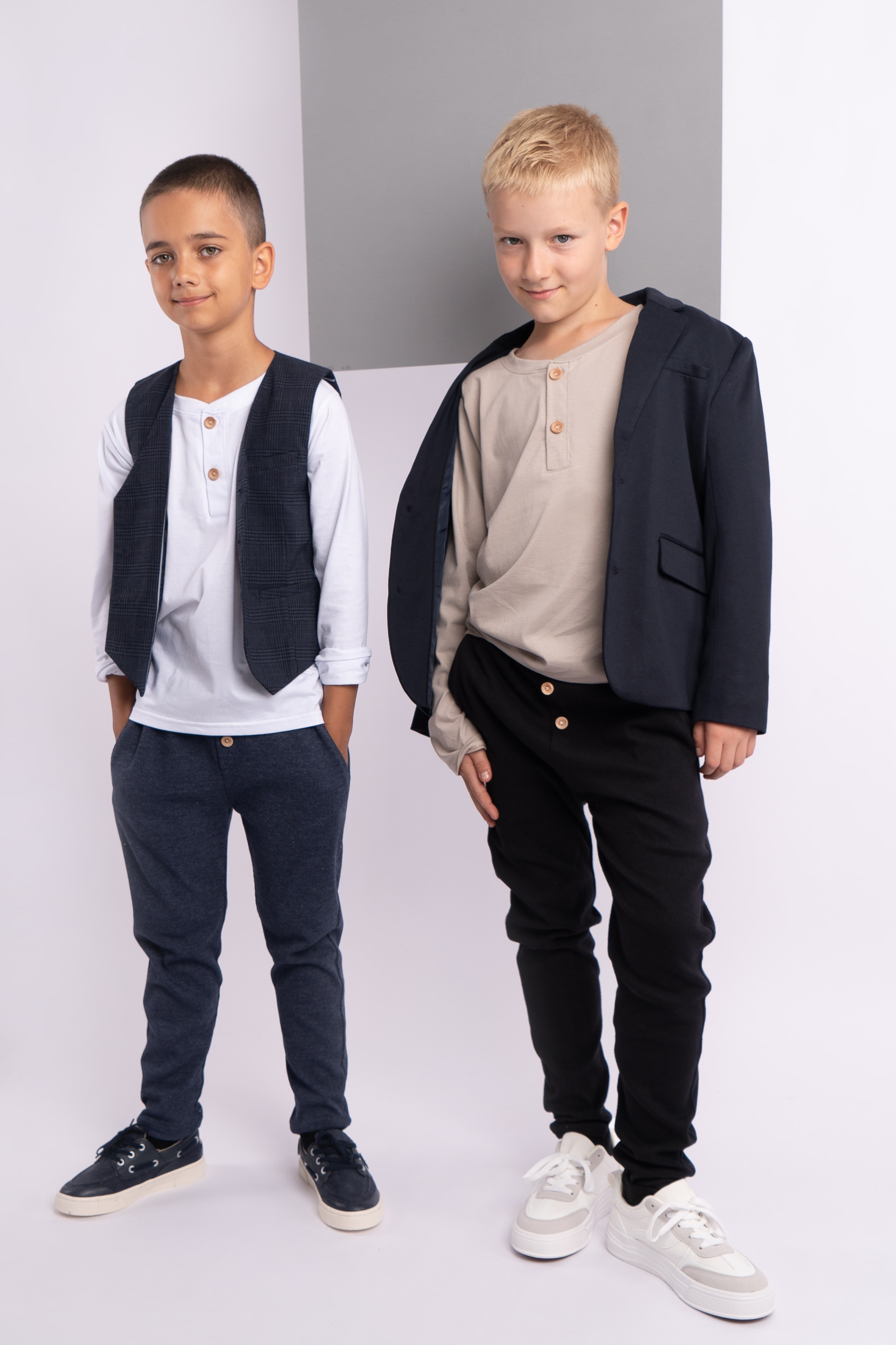 Nasza kolekcja eleganckich spodni z kieszeniami i eleganckimi, drewnianymi guziczkami to doskonałe rozwiązanie dla rodziców poszukujących wygodnych i praktycznych rozwiązań na stylizacje dla swoich dzieci. Zobacz inne ubrania wizytowe dla chłopca.