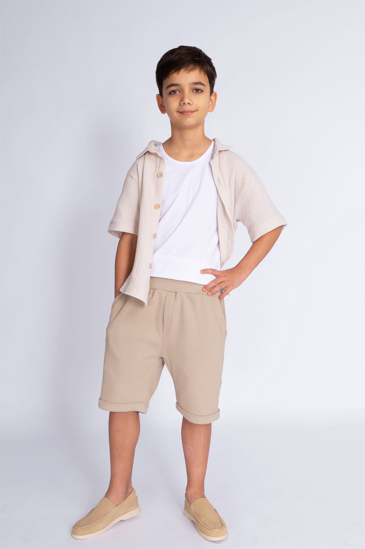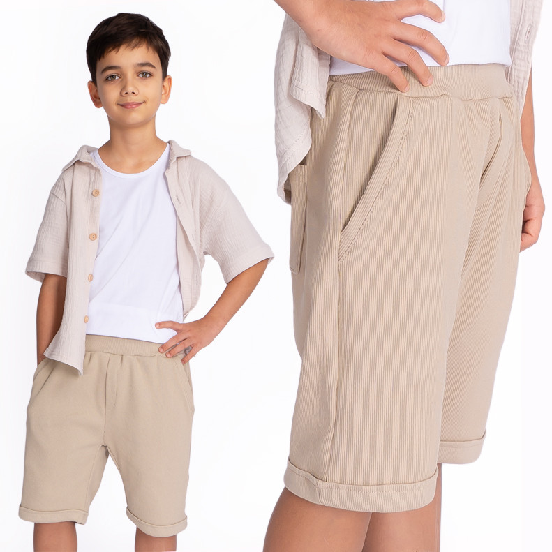 Krótkie spodenki chłopięce z bawełny prążkowanej w kolorze beżowym.