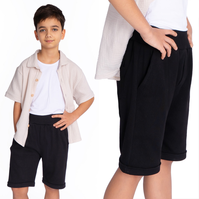 Krótkie spodenki chłopięce z bawełny prążkowanej w kolorze czarnym.